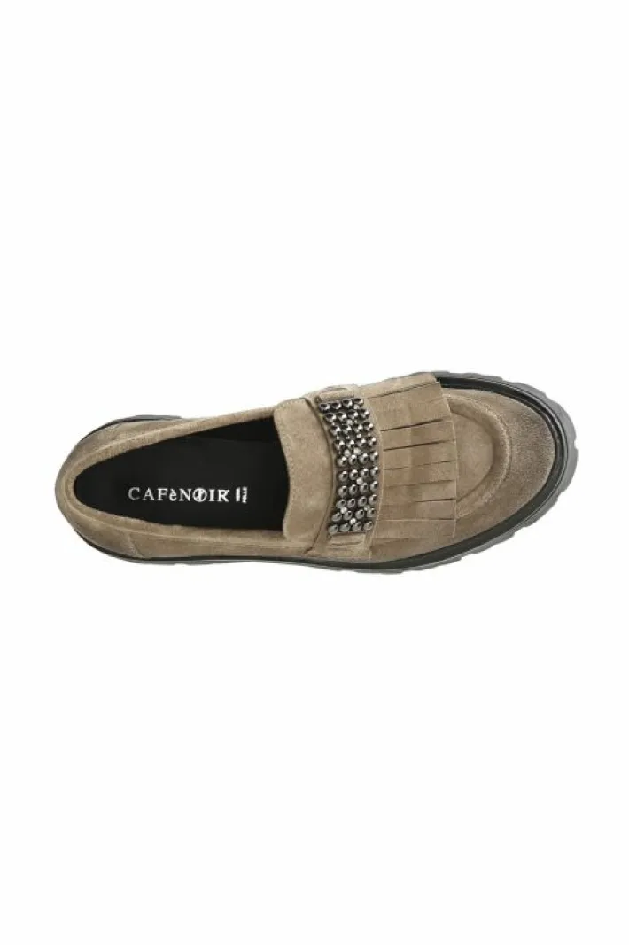 Mocassino in pelle scamosciata con frange ed accessorio gioiello. il soletto è in pelle. la suola carro armato in materiale extralight slancia la modelleria e la rende iper attuale.