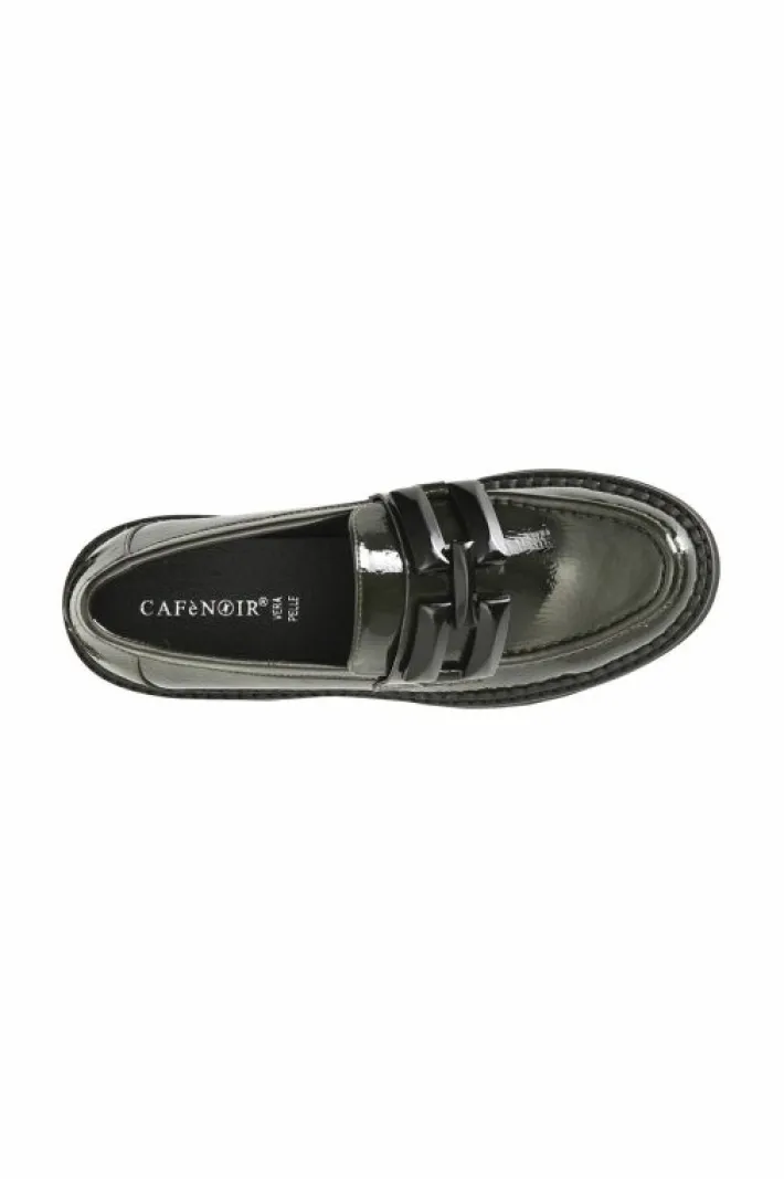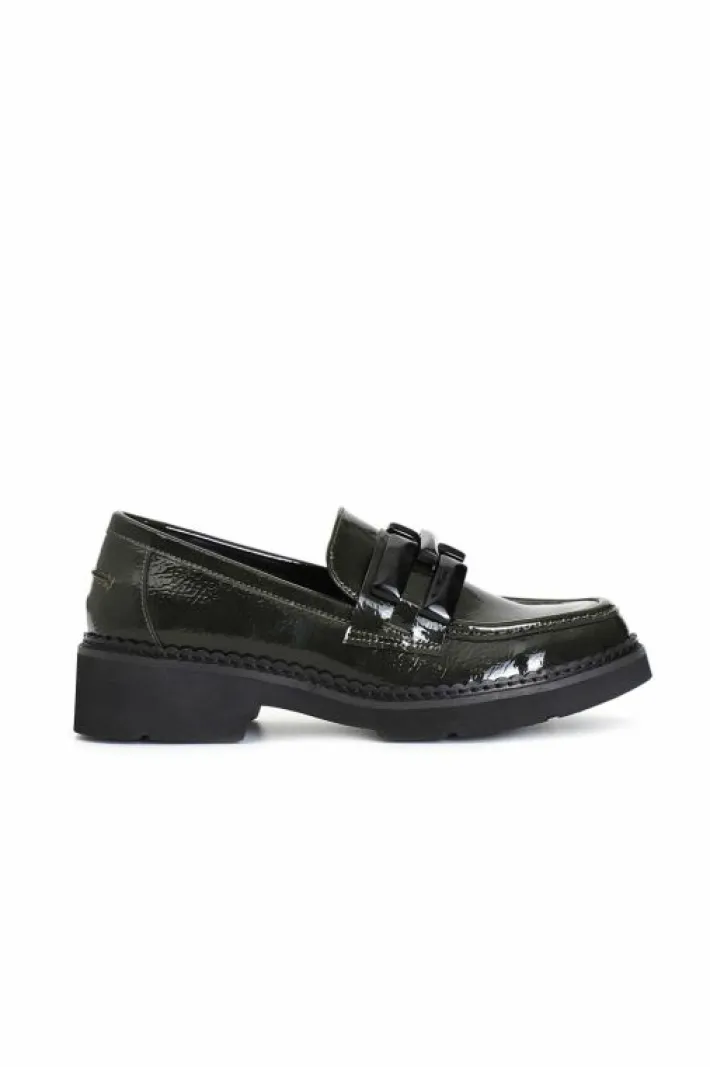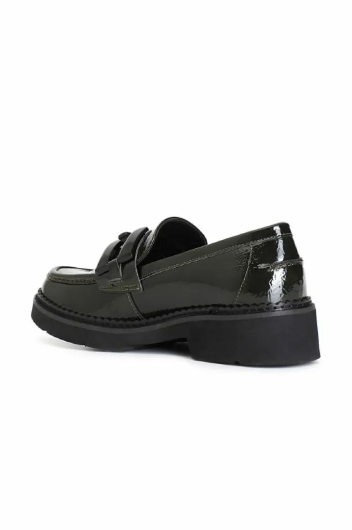 Mocassino da donna in similpelle effetto vernice arricchito da morsetto sul passante. il soletto è in pelle.