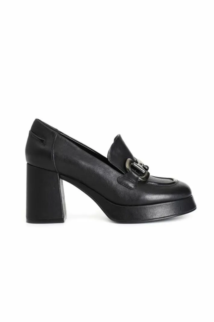 Mocassino da donna in nappa con morsetto. tacco 80 mm plateau 20 mm. fodera e soletto sono in pelle. comodità ed eleganza allo stesso tempo ed un carattere unico adatto ad ogni outfit.