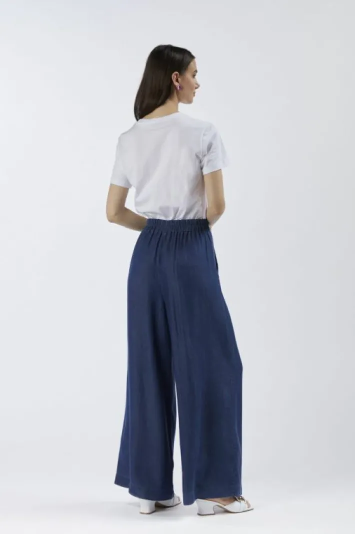 Pantaloni lunghi e ampi con pieghe davanti. realizzati in tencel jeans. tasche laterali. cinturino elastico nella parte posteriore per aumentarne la comodità.