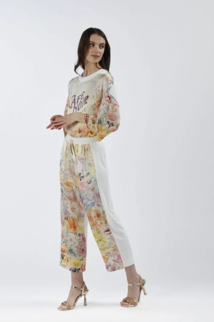 Pantaloni bimateriale tipo jogger con vita elasticata. il davanti è realizzato in un satin di viscosa stampato e il dietro è realizzato in jersey. dalla linea morbida sono comodi e nel contempo fashion per un look casual impeccabile.