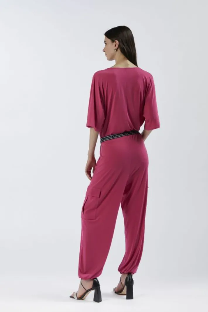 Pantaloni modello cargo con ampie tasche laterali. vita elasticata con elastico logato e polsino anch’esso elasticato.