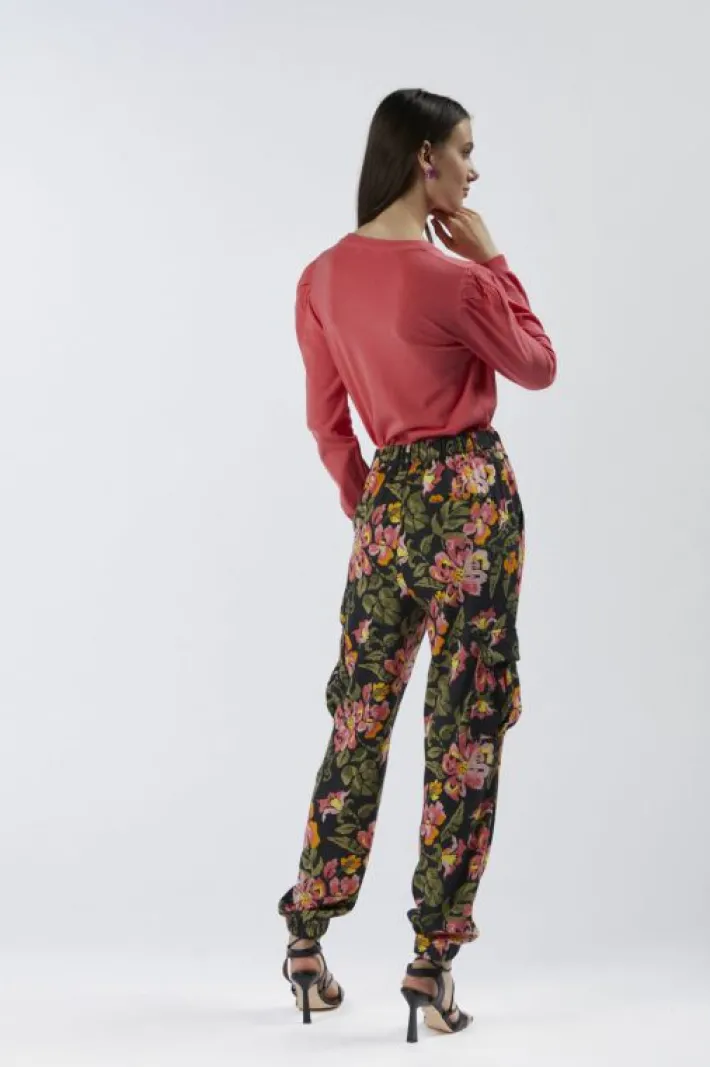 Pantaloni tipo cargo con ampie tasche laterali e polsino elasticato al fondo realizzato in twill di viscosa stampato. st…