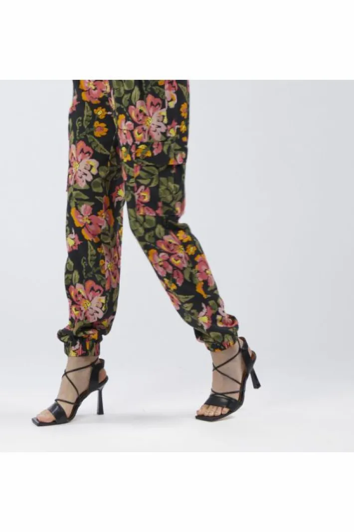 Pantaloni tipo cargo con ampie tasche laterali e polsino elasticato al fondo realizzato in twill di viscosa stampato. stampa esclusiva cafènoir.