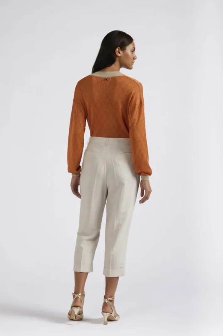 Pantaloni cropped con maxy risvolti al fondo. realizzati in un fresco tessuto misto lino.