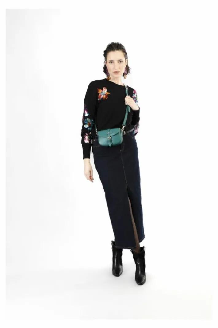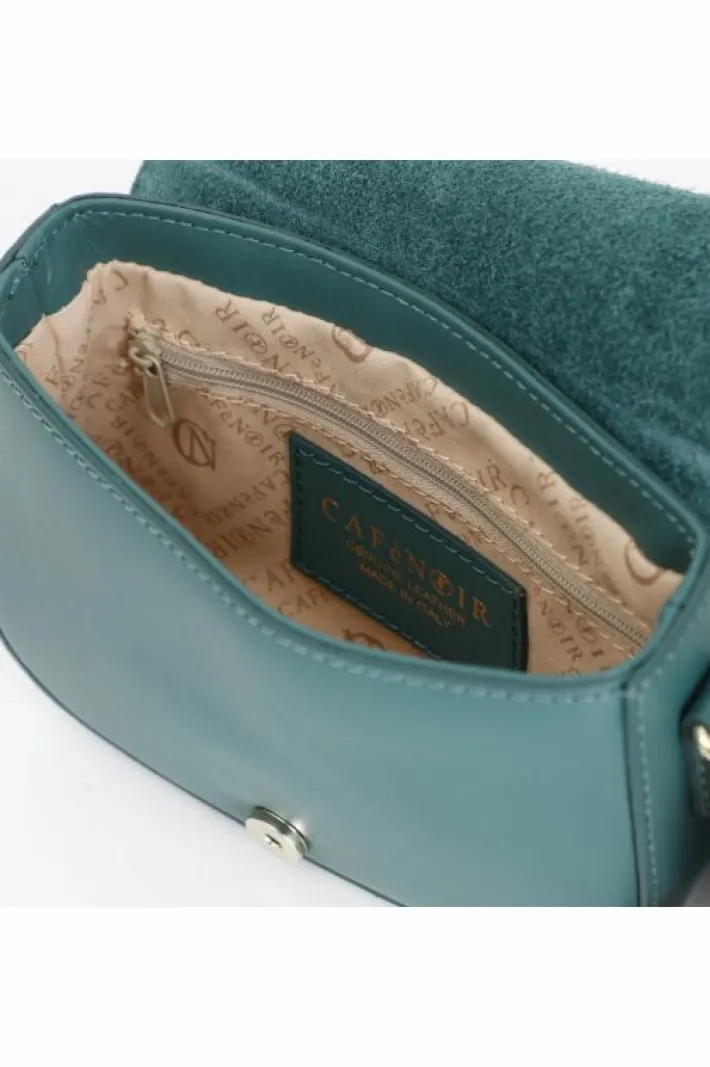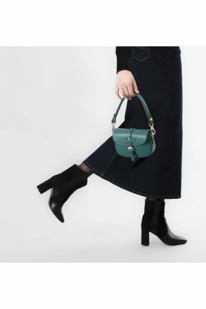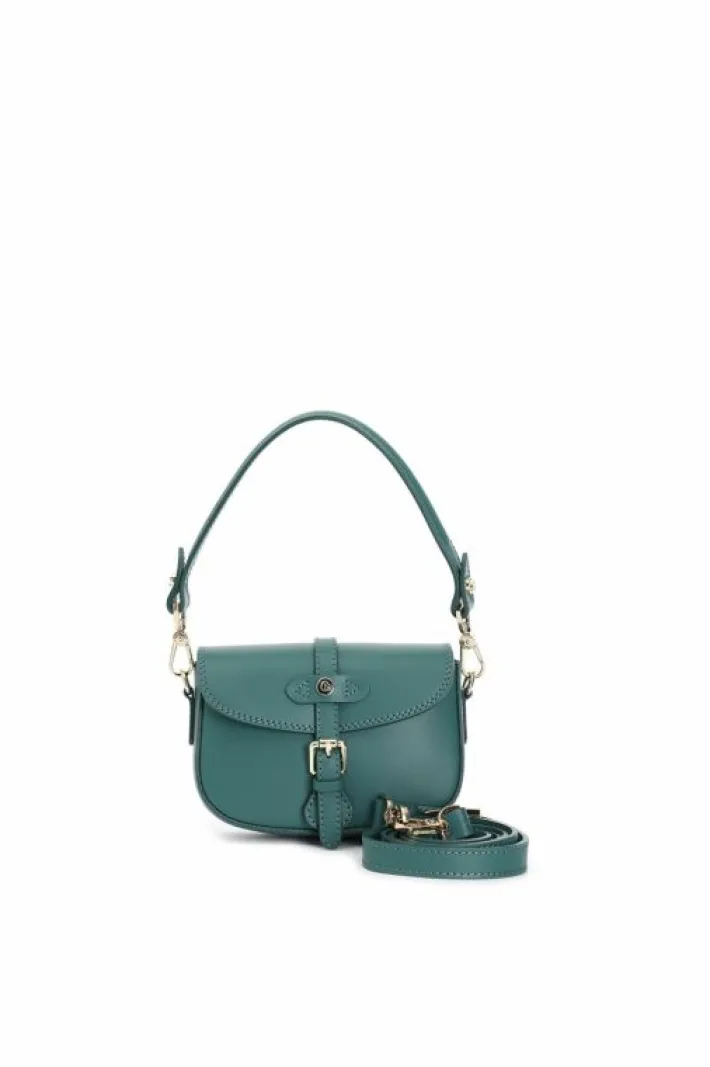 Pattina in pelle con tracolla corta passante con rivetto smaltato e fibbia. chiusura con calamita tracolla removibile.
