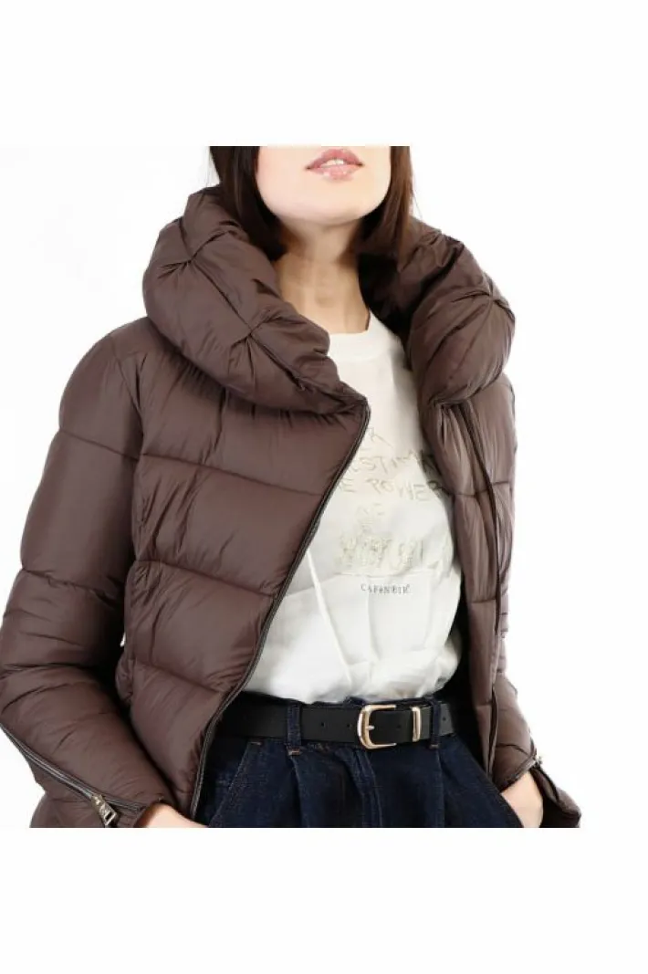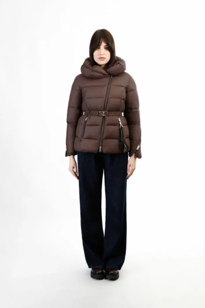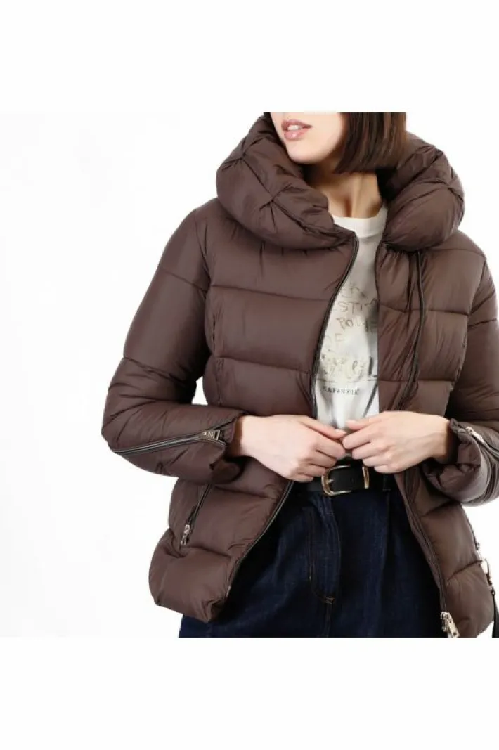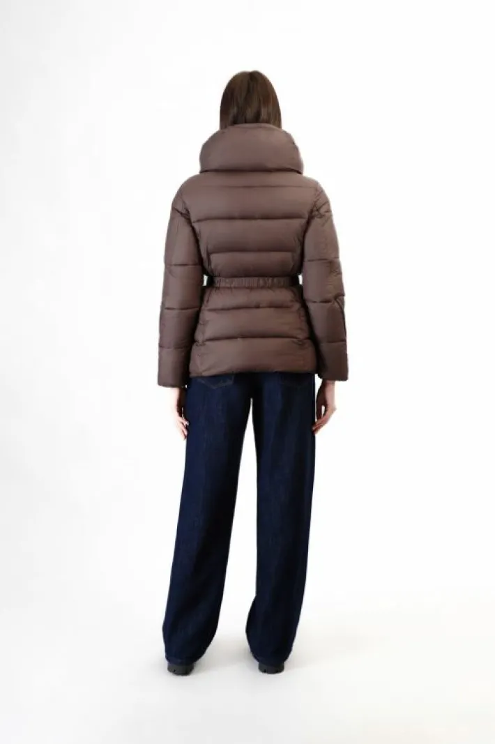 Piumino corto con collo avvolgente e cintura logata nel punto vita. realizzato in nylon matt. versatile e pratico capo immancabile nel guardaroba della nuova stagione autunno inverno.