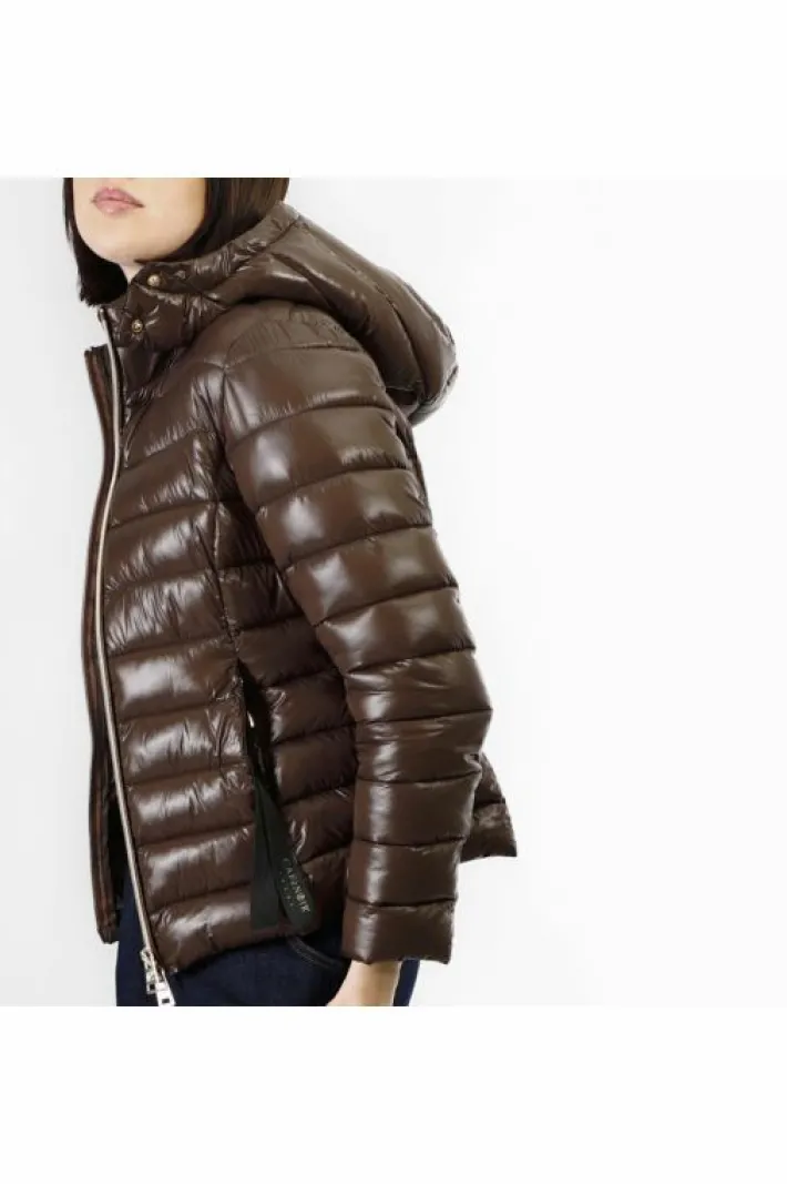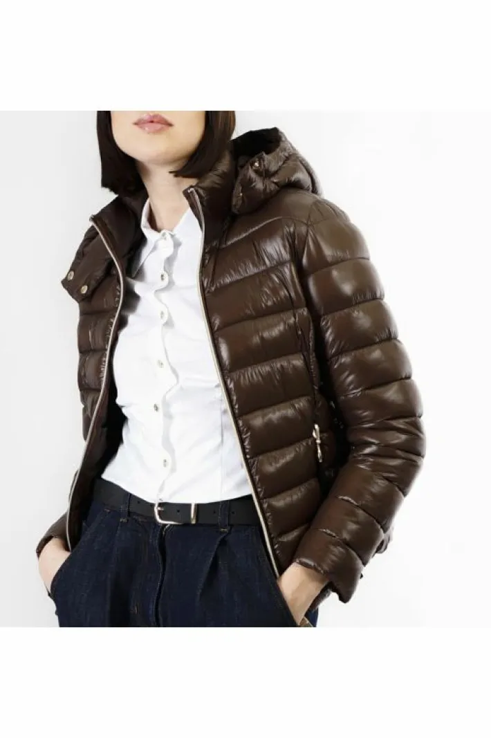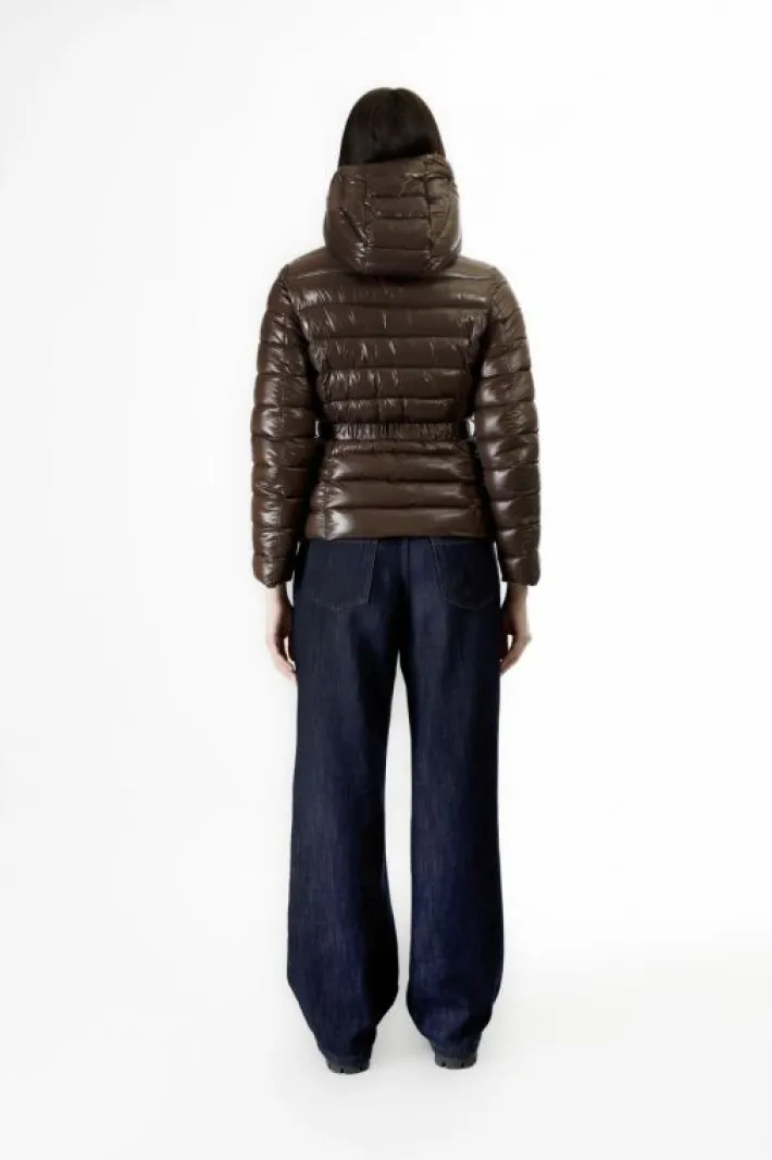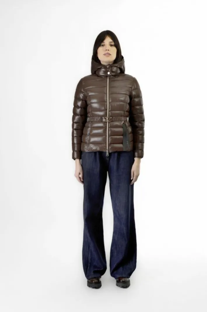Piumino corto con cintura dalla fibbia logata realizzato in nylon ultraligth dalla finitura lucida. cappuccio removibile. versatile e pratico capo immancabile nel guardaroba della nuova stagione autunno inverno.