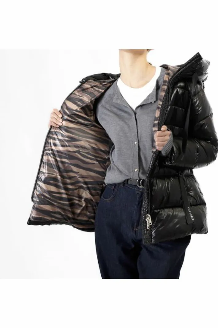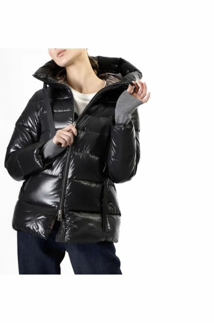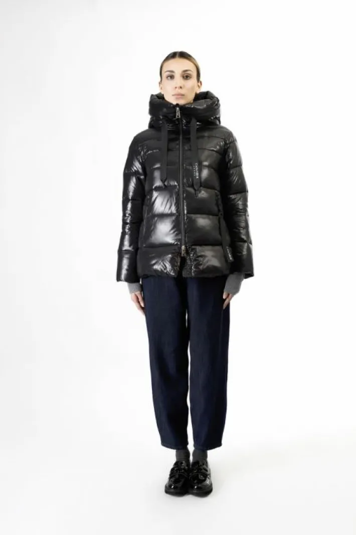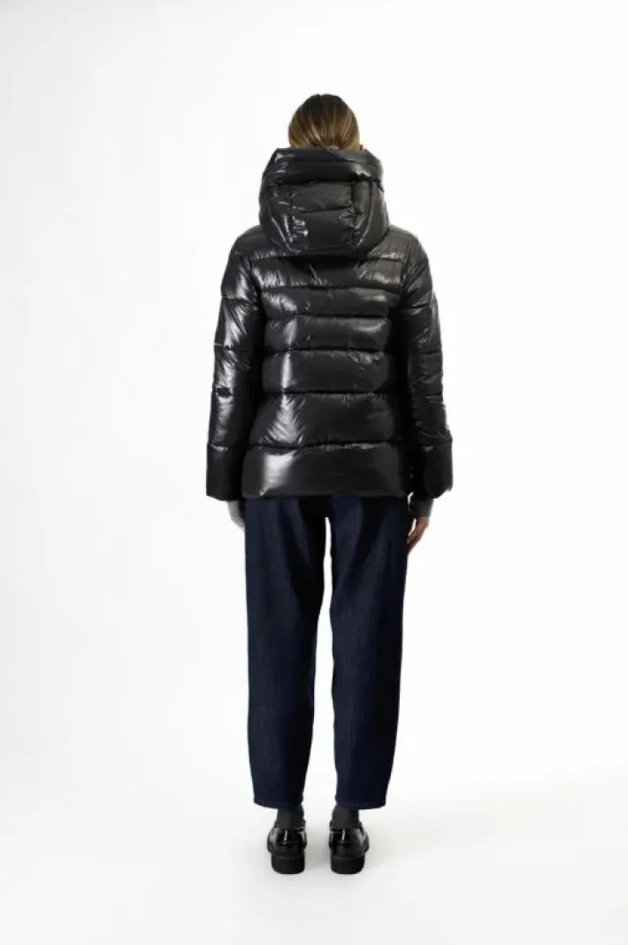 Piumino con cappuccio fisso realizzato in tessuto superlight dalla finitura lucida. fodera con nostro slogan “be noir” in nylon stampata. è presente all’interno una pratica bretella realizzata in nastro jacquard logato che permette di indossare il capo come uno zaino nelle giornate piu calde.