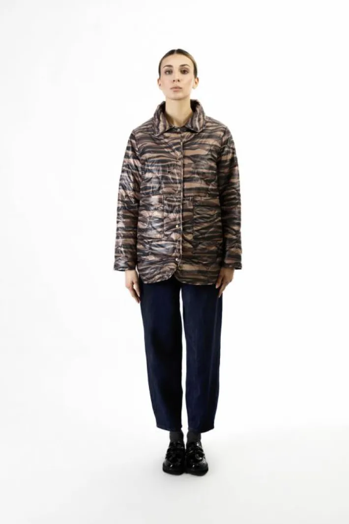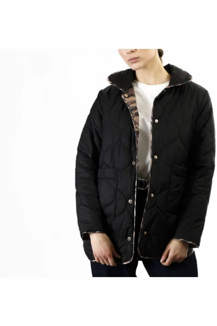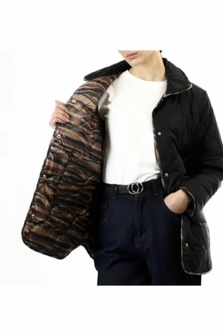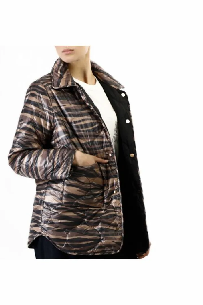 Piumino reversibile con un lato tinta unita e un lato stampato. tasche su entrambi i lati applicate. capo perfetto per attacco stagione.