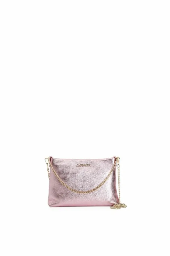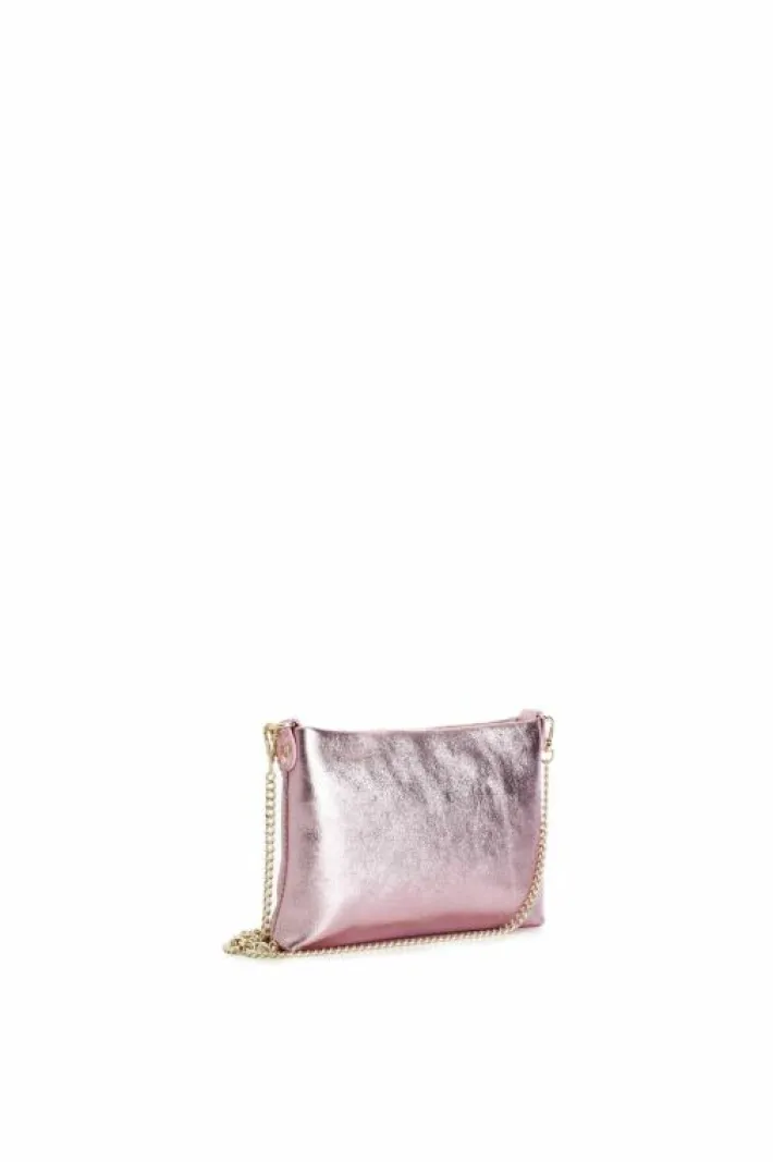 Pochette in pelle laminata con tracollina in catena. chiusura con cerniera.