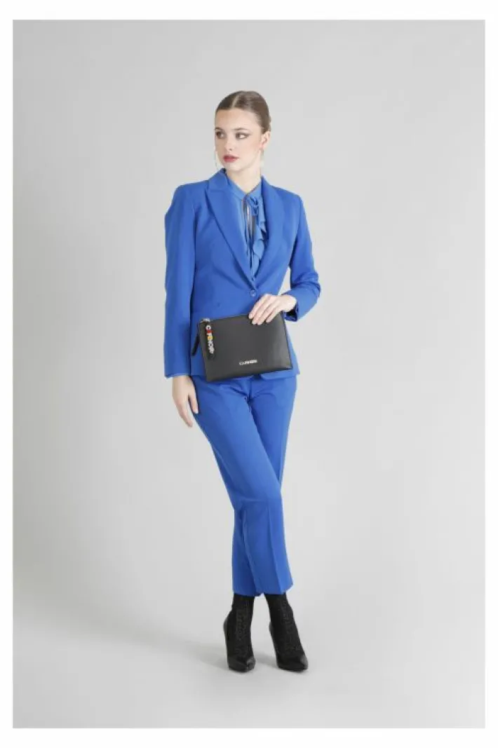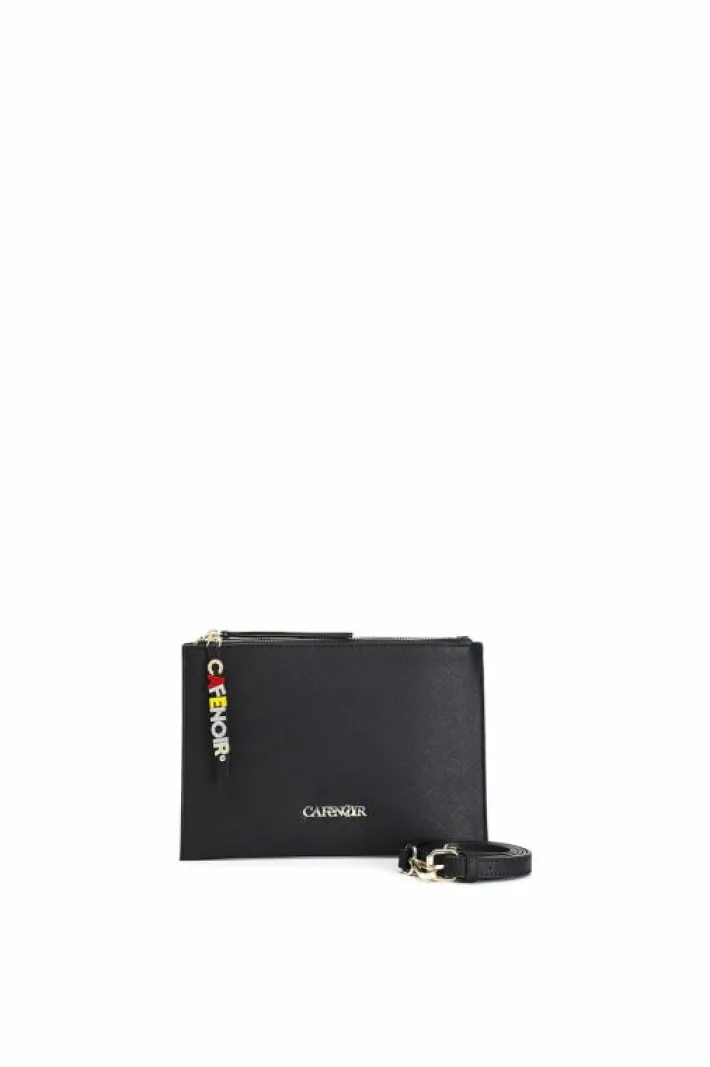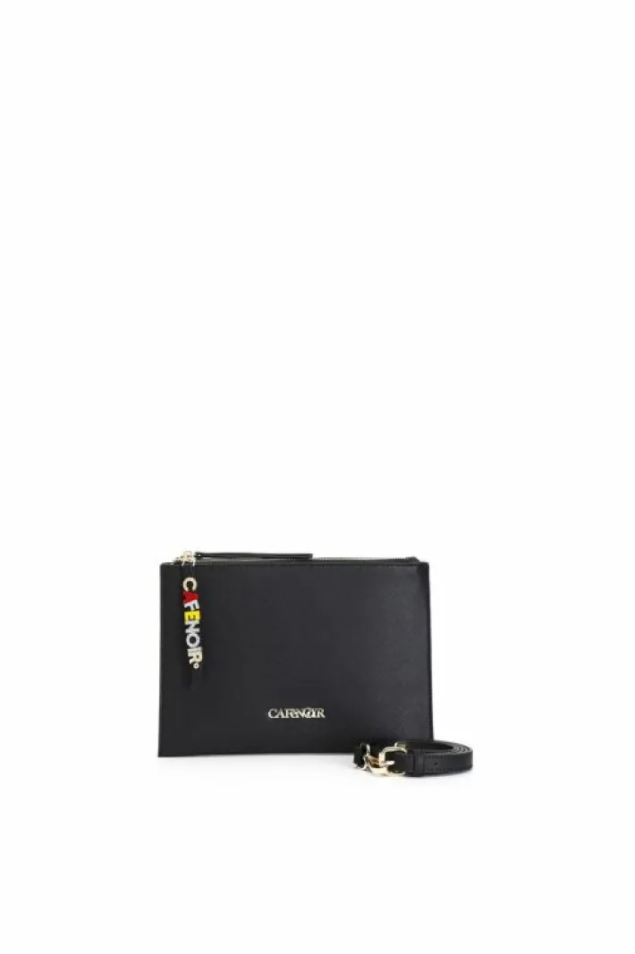Pochette dalla struttura rigida in saffiano. tiralampo con letterine personalizzate e colorate. chiusura con cerniera. tracolla regolabile.