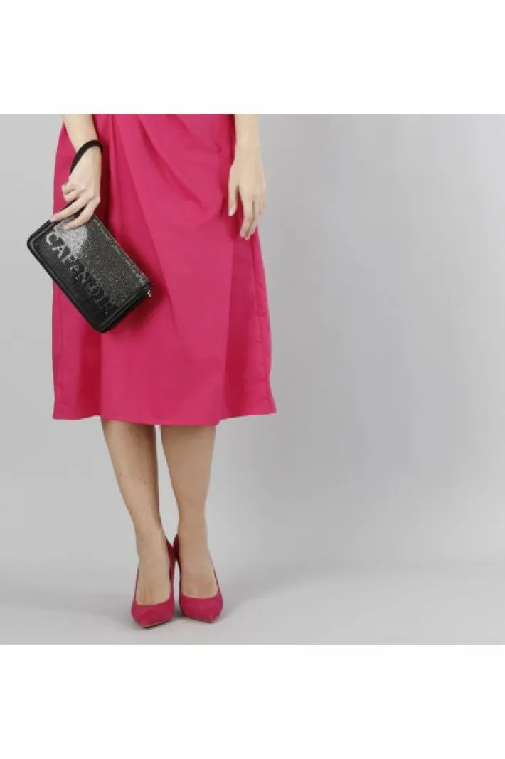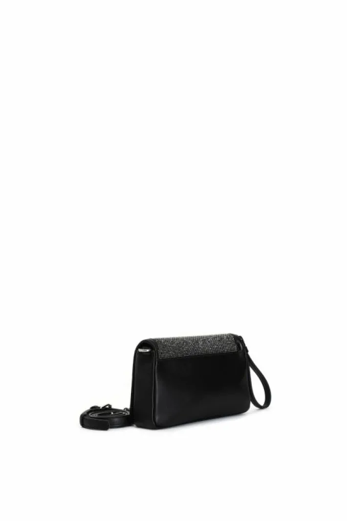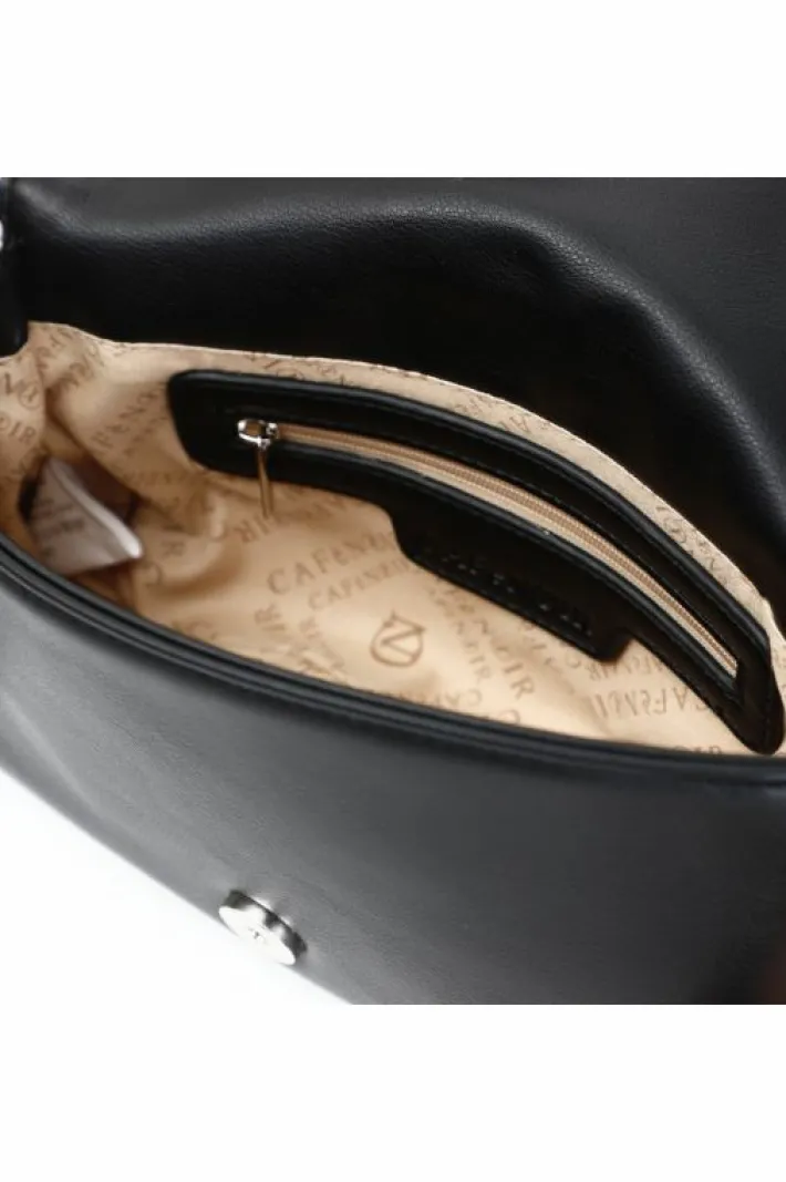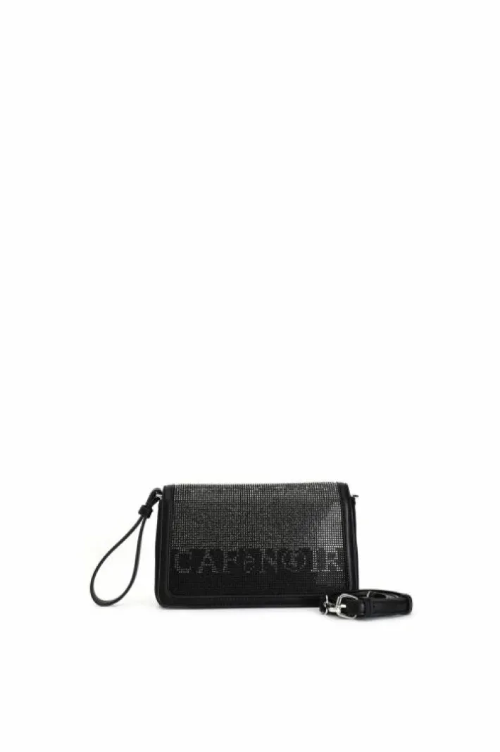 Pochette con pattina. logo cafènoir in strass bicolor. la parte dietro è effetto specchio. manigliotto e tracolla.
