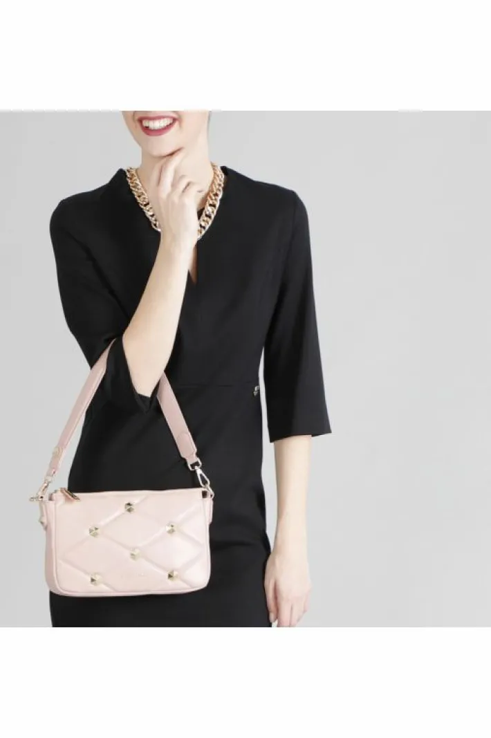 Pochette trapuntata con borchie esagonali e logo ambossed. borsa provvista di unico scomparto di un taschino interno con zip e di tracolla. chiusura con cerniera.