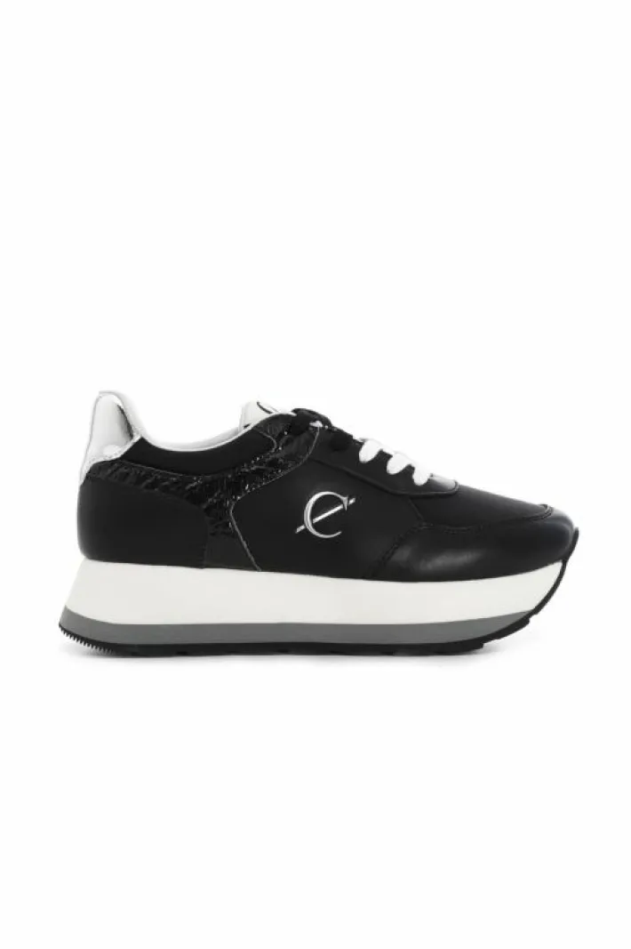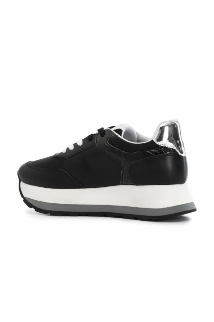 Sneakers da donna con suola running allacciate. calzatura in pelle rivestita e tessuto con riporti effetto shimmer. logo argentato laterale con monogramma cafènoir. altezza suola 30 mm. fussbett interno.