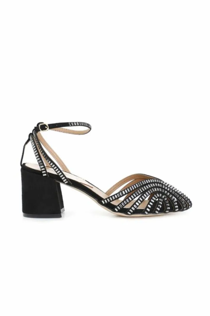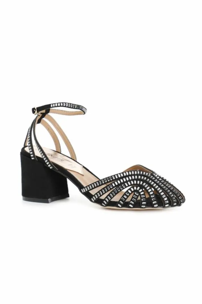 Sandali a gabbia laccio alla caviglia in microfibra e strass tacco h.60mm