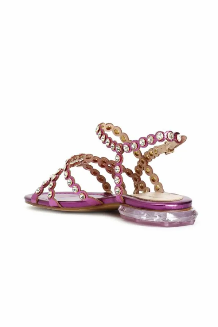 Sandali asimmetrici con multilistini e strass. la forma particolare del tacco rende la calzatura super chic e super glamour. comodo soletto imbottito per una calzata morbida. tacco alto 20mm.