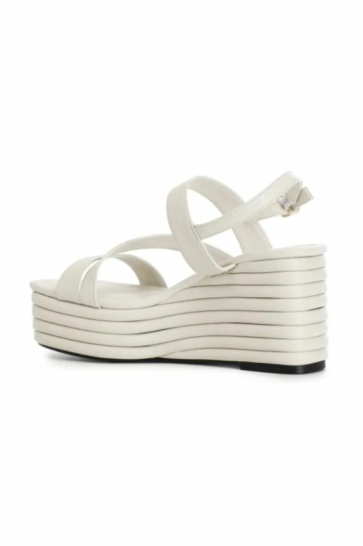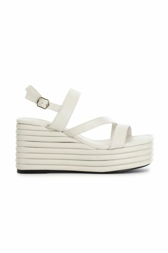 Sandali in nappa con cinturini asimmetrici. zeppa effetto imbottito. il comodo soletto in vera pelle fa risultare la calzatura comoda anche dopo svariate ore di utilizzo. il tacco è alto 70mm il plateau invece è di 35mm.