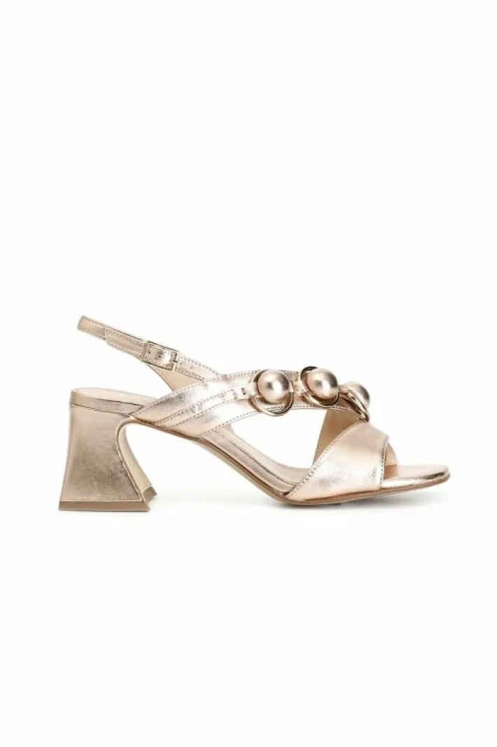 Sandali con tomaia asimmetrica in pelle laminata e accessorio a tre sfere a decoro. calzatura che può essere indossata tutto il giorno grazie al tacco a base larga alto 55mm e alla comoda base d’appoggio.