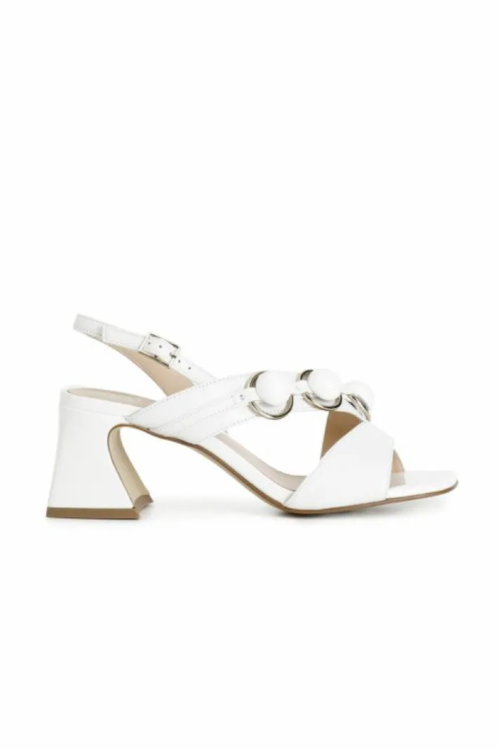 Sandali con tomaia asimmetrica in nappa e accessorio a tre sfere a decoro. calzatura che può essere indossata tutto il giorno grazie al tacco a base larga alto 55mm e alla comoda base d’appoggio.