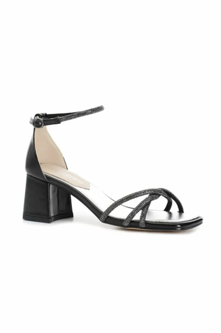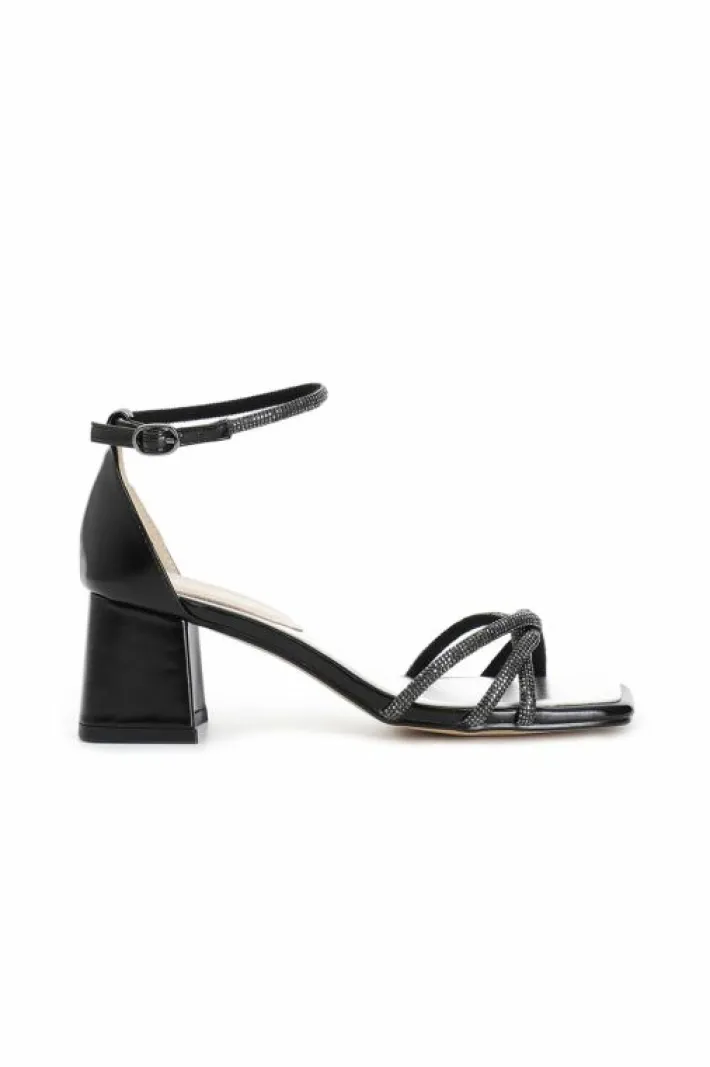 Sandali chiusi dietro con tre listelli e cinturino alla caviglia ricoperti con microstrass. tacco h. 65mm.