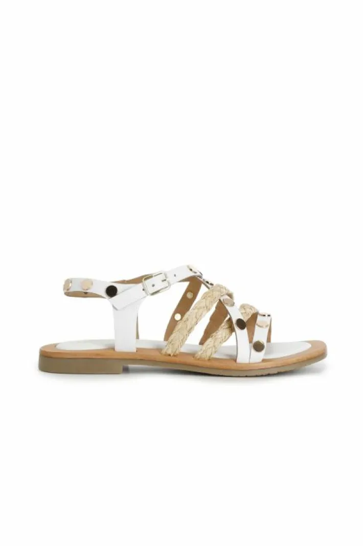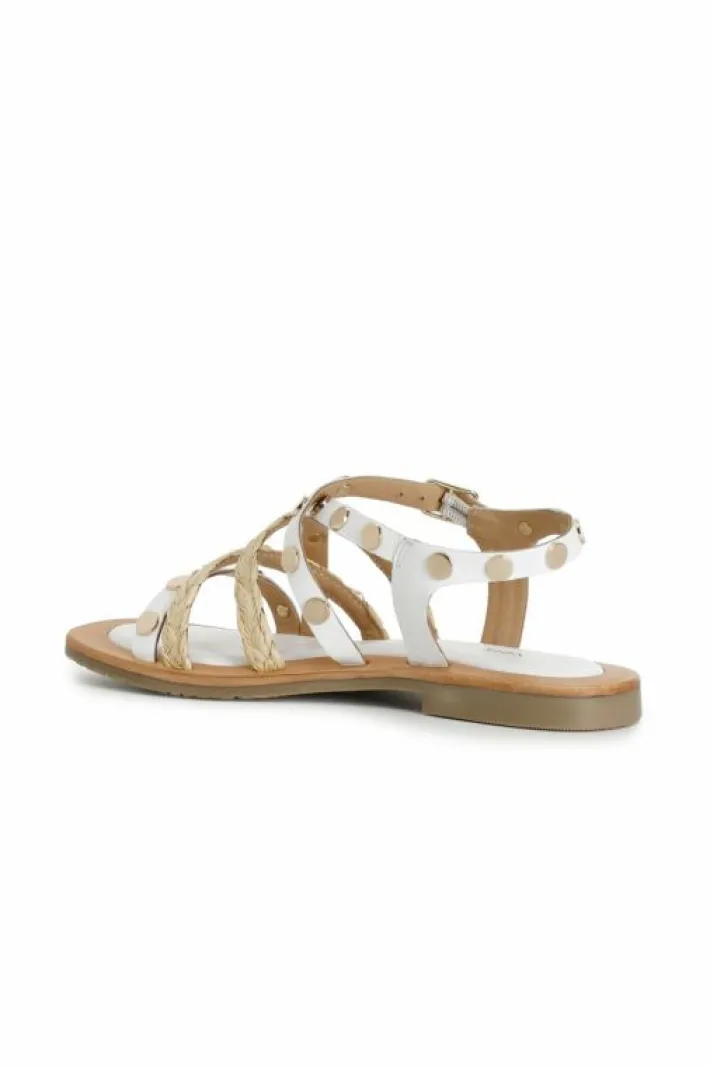 Sandali con fasce in pelle e rafia alternate decorate da borchie dorate.