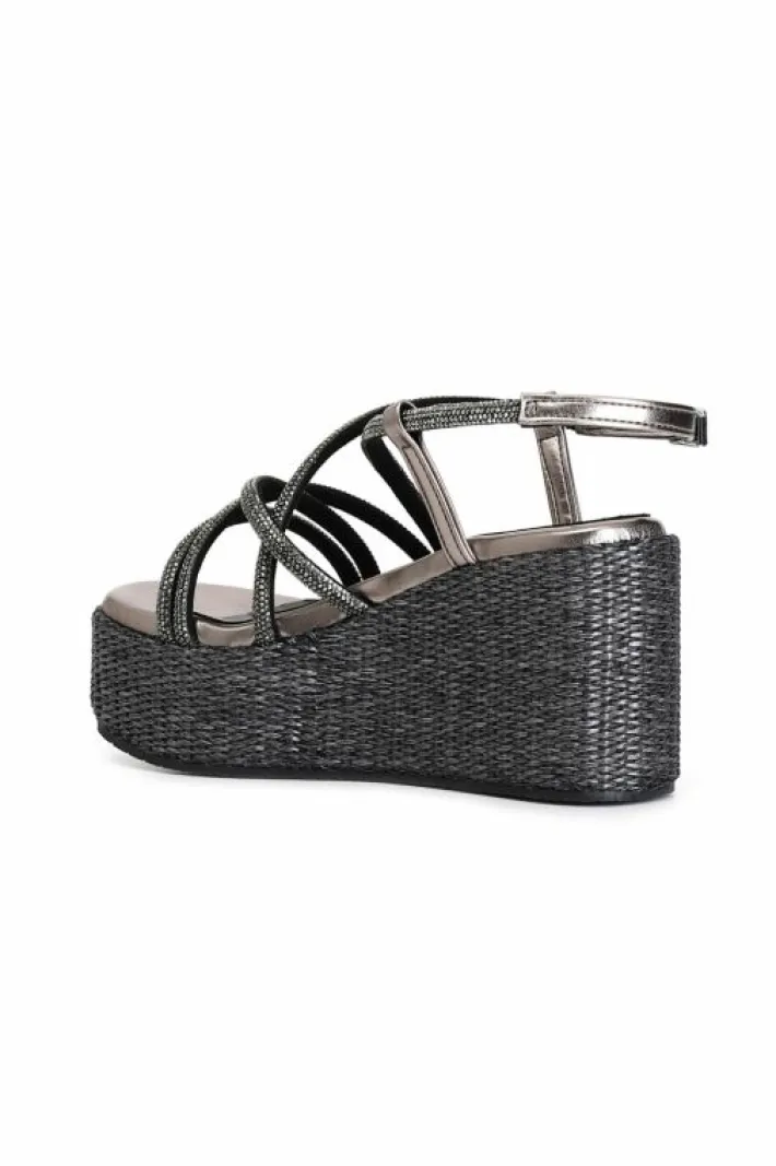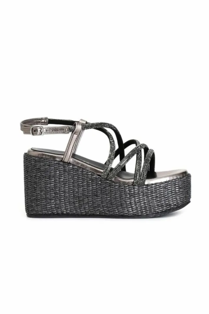 Sandali con fasce in strass incrociati e cinturino con fibbia alla caviglia. zeppa fasciata in rafia.