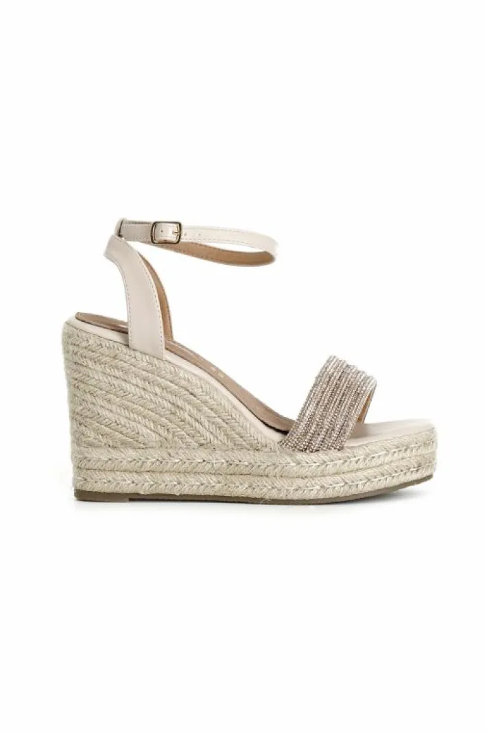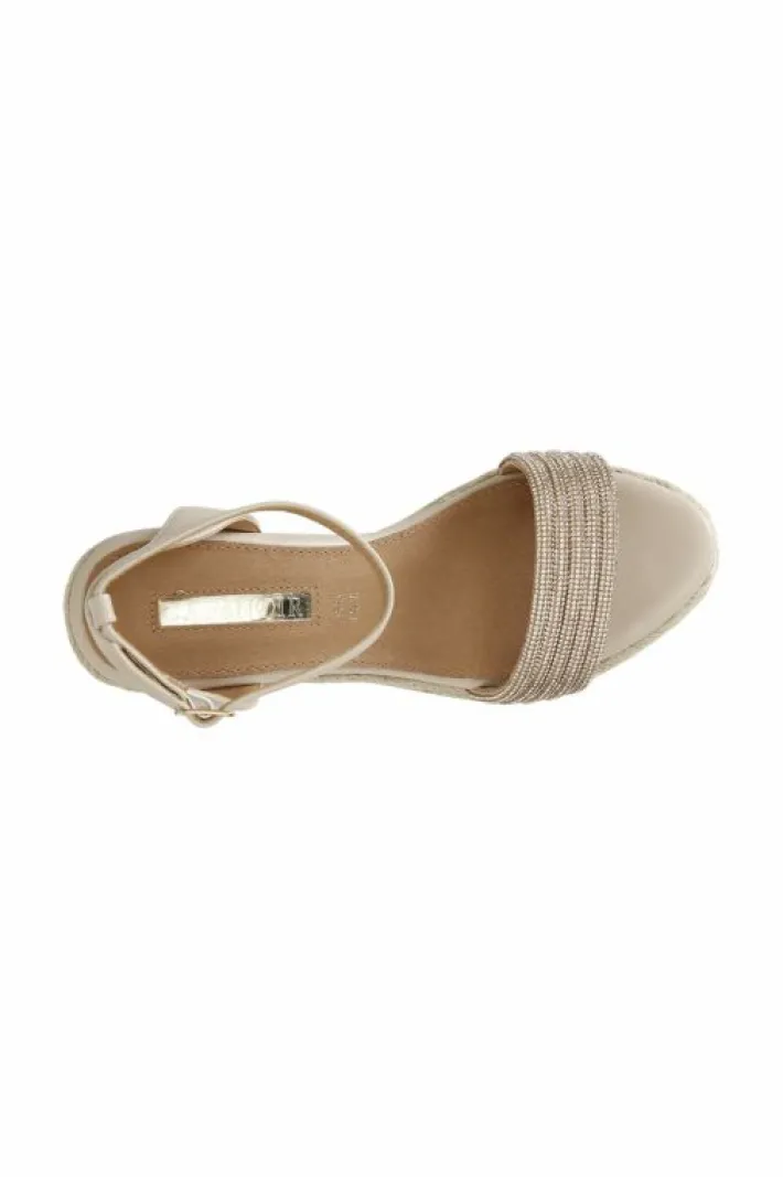 Sandali con fasce strass su zeppa in corda e plateau. cinturino alla caviglia.