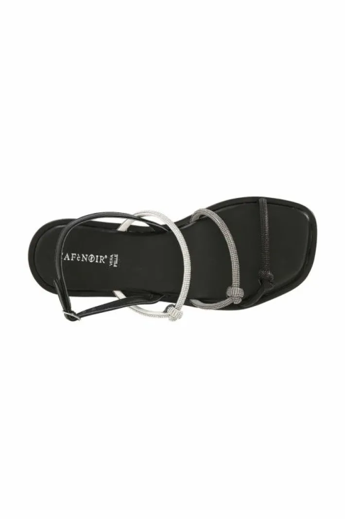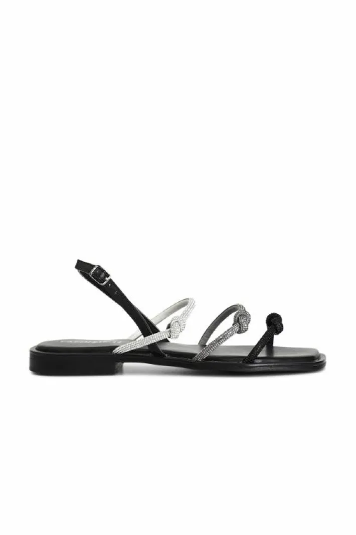 Sandali con tre fasce con nodo ricoperte di microstrass. cinturino con fibbia regolabile.