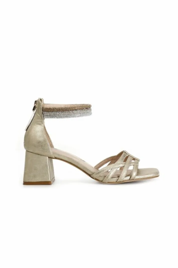 Sandali effetto laminato con toppone chiuso decorato da fasce in strass alla caviglia. il soletto imbottito in vera pelle fa risultare la calzatura comoda anche dopo svariate ore di utilizzo. il tacco è di 50mm.