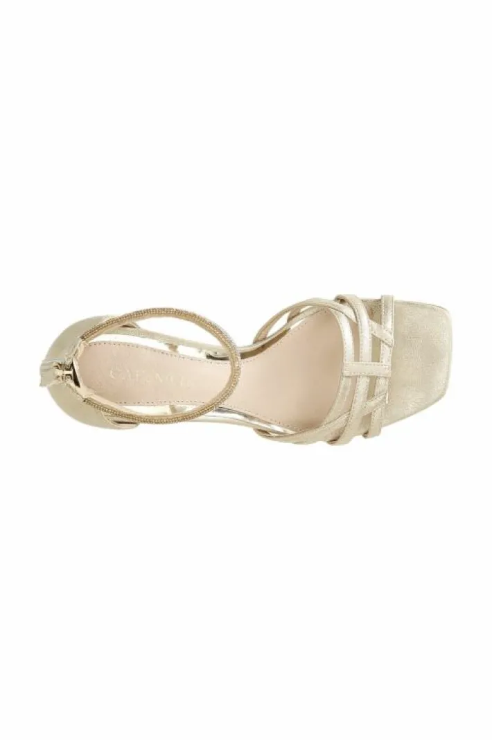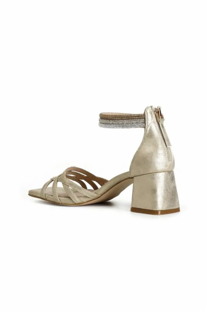 Sandali effetto laminato con toppone chiuso decorato da fasce in strass alla caviglia. il soletto imbottito in vera pell…