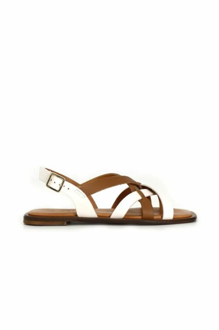 Sandali bassi con gabbia asimmetrica bicolor in pelle che decora il collo del piede.