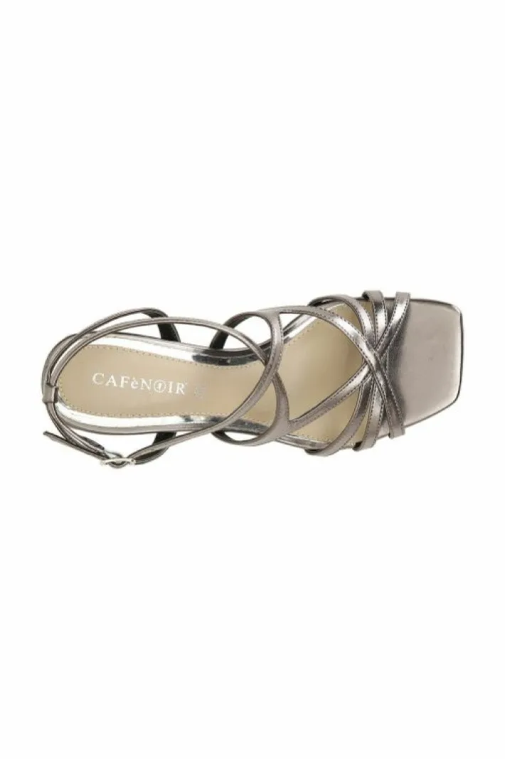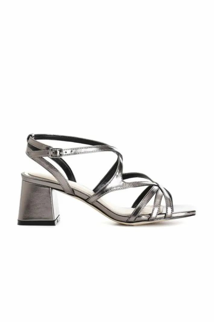 Sandali effetto laminato con laccini incrociati. il soletto imbottito in vera pelle fa risultare la calzatura comoda anche dopo svariate ore di utilizzo. il tacco è di 50mm.