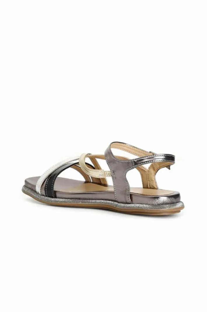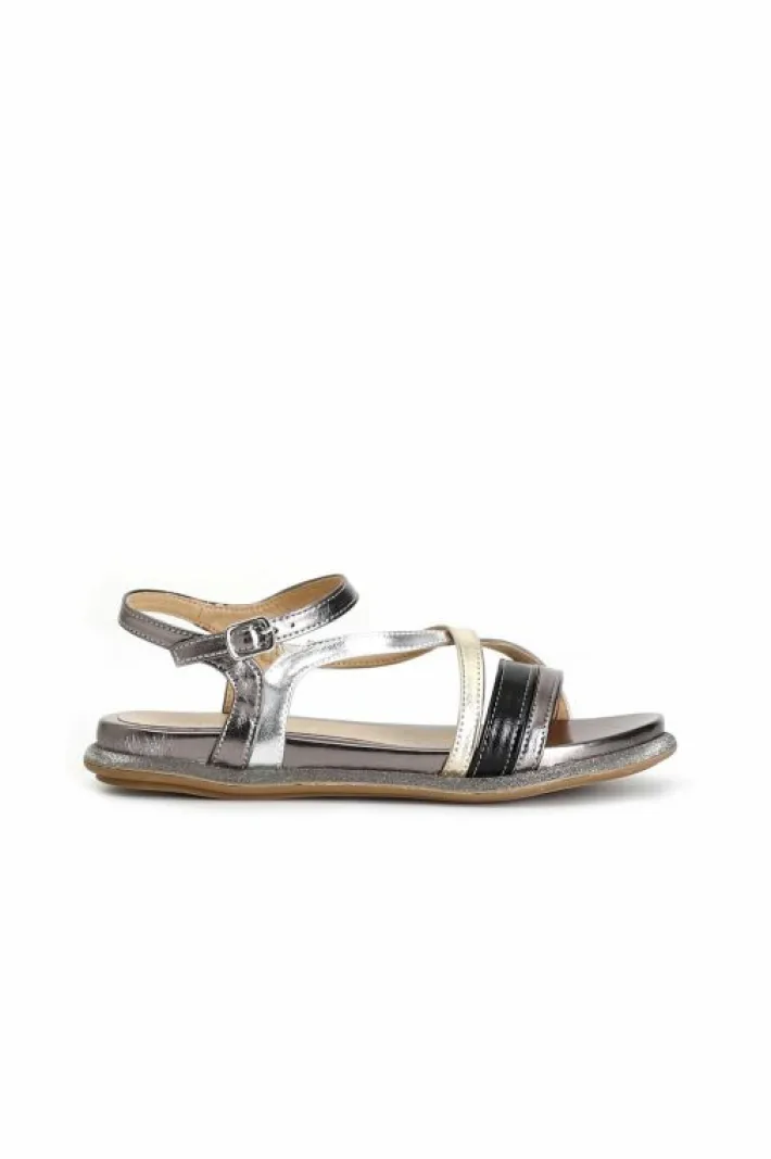 Sandali bassi in similpelle laminata con intreccio multicolore.