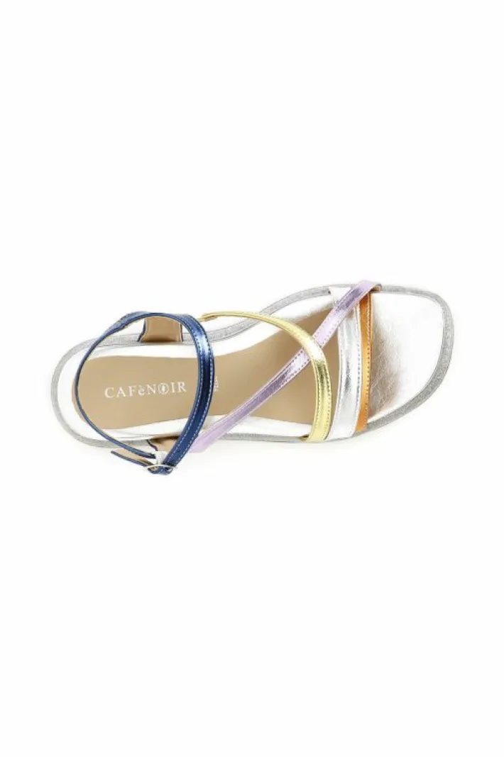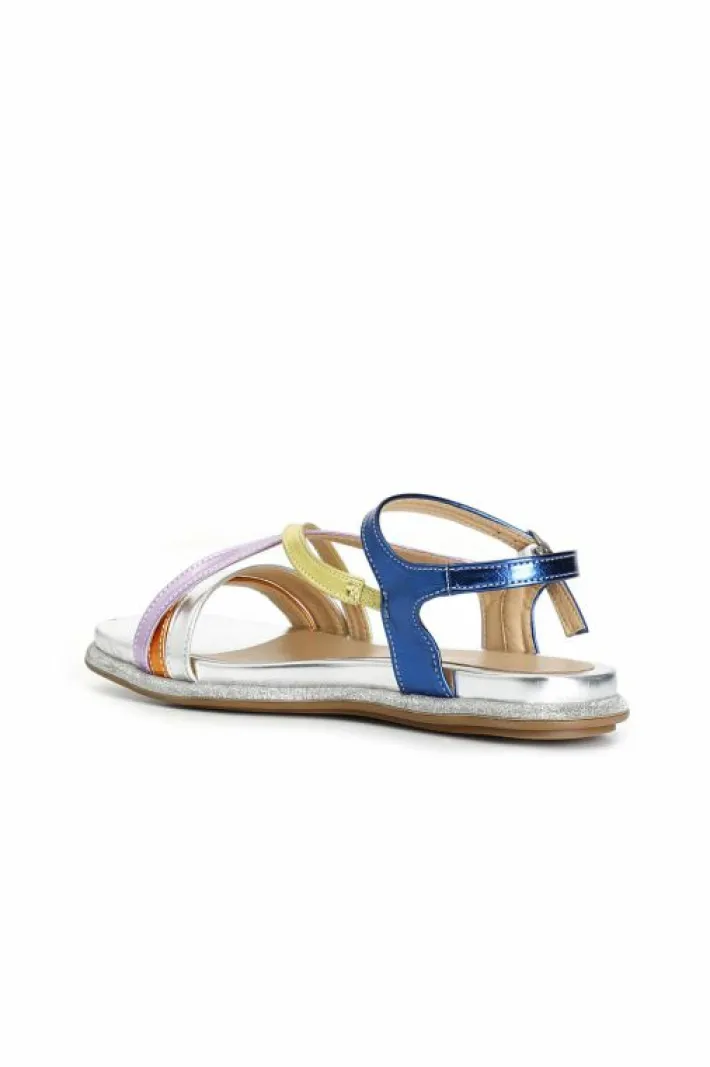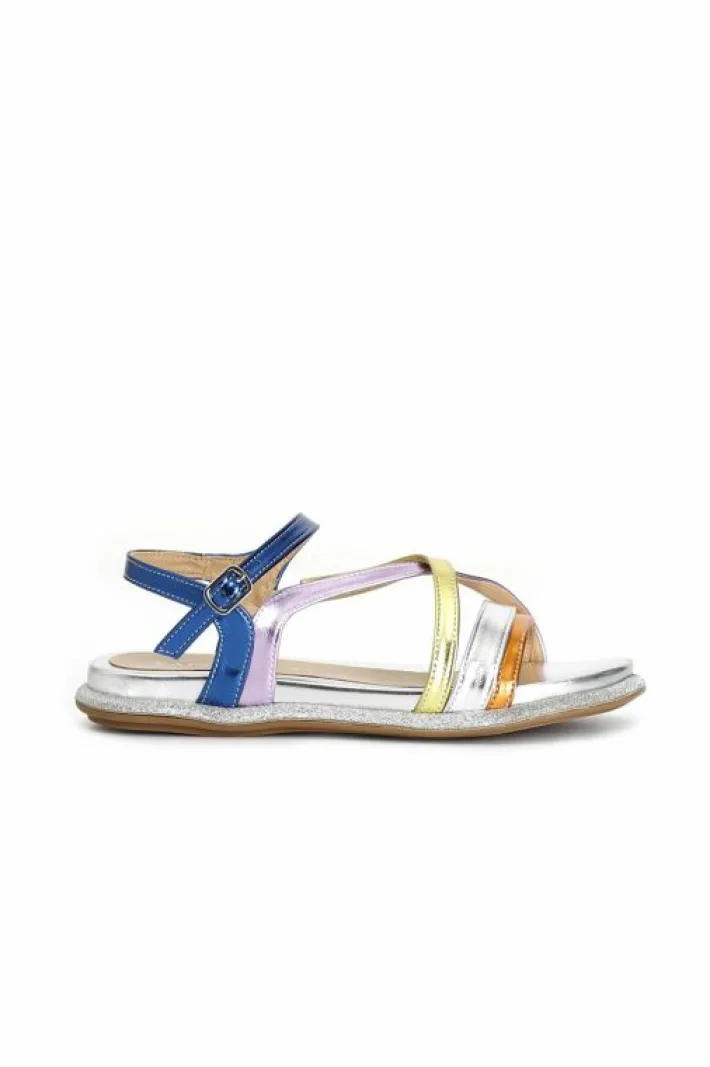 Sandali bassi in similpelle laminata con intreccio multicolore.