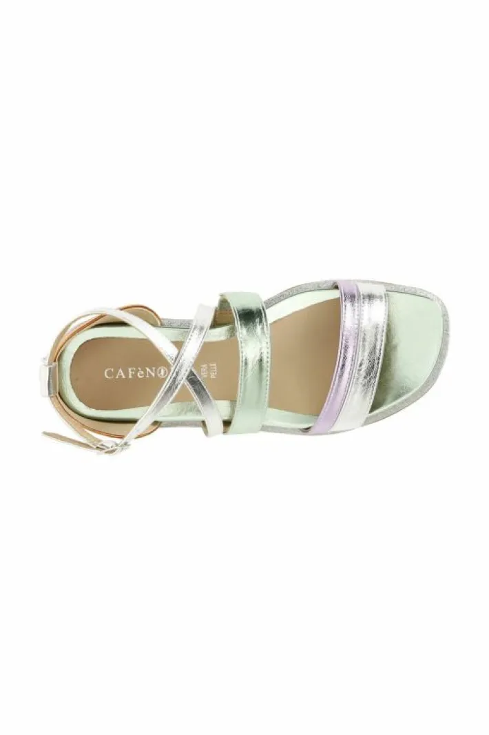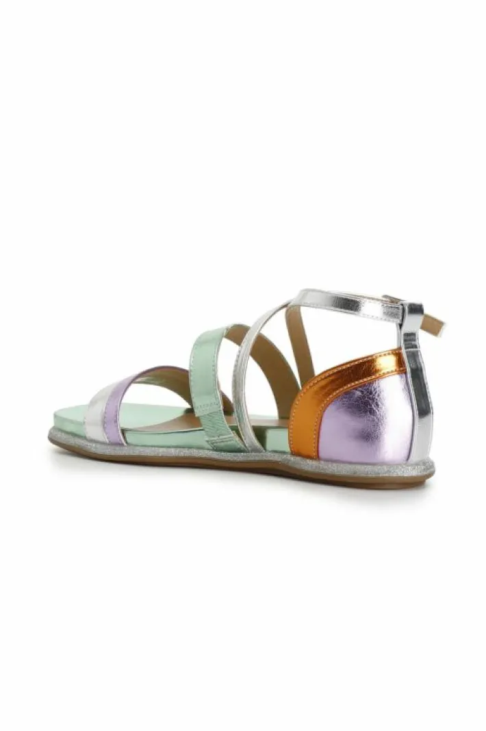 Sandali bassi in similpelle laminata multicolor dai toni pastello. tallone coperto e cinturino alla caviglia.