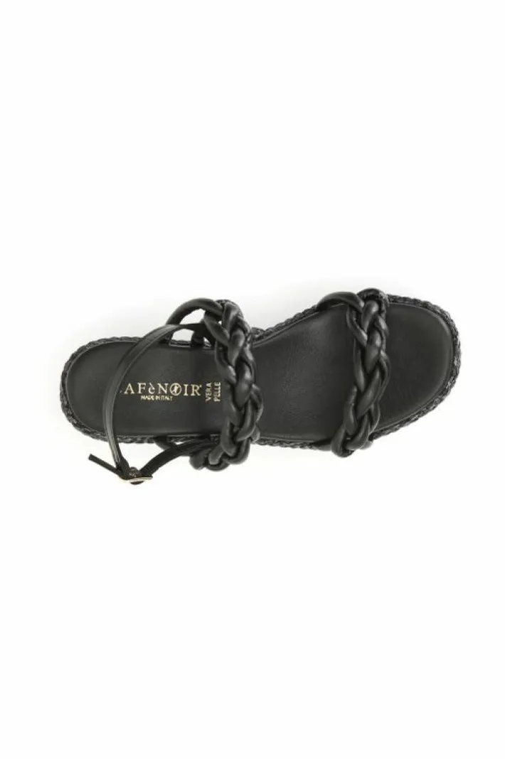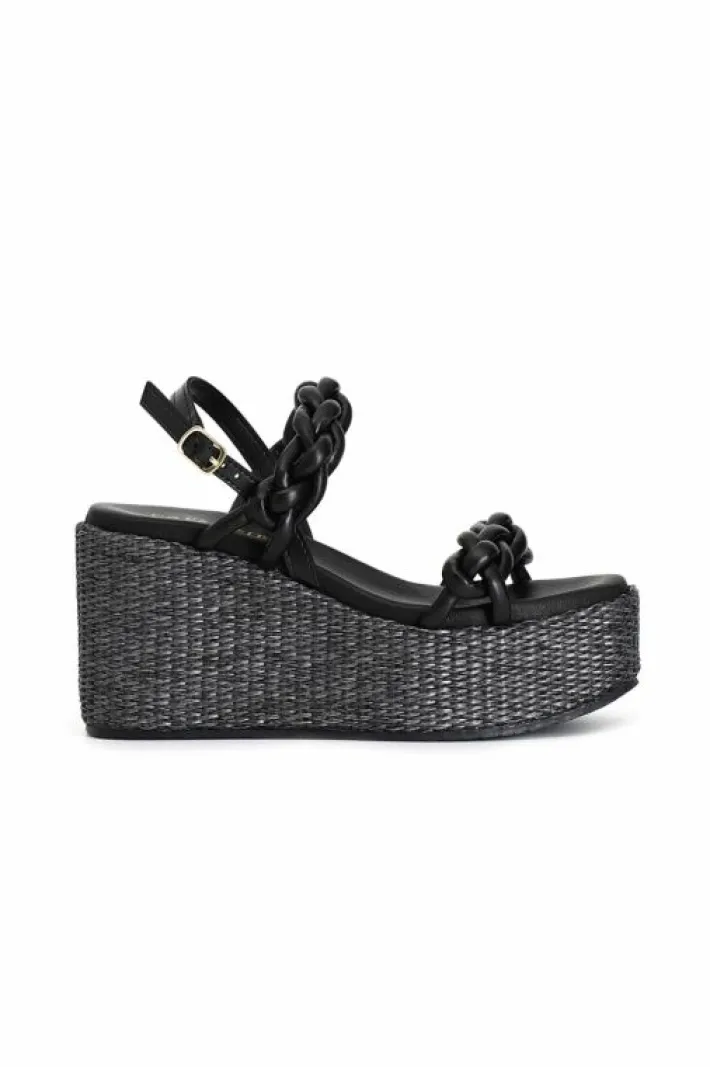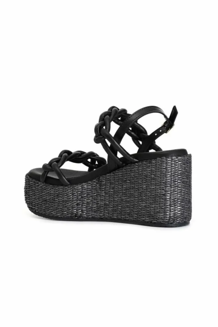 Sandali modello frate con tomaia intrecciata. zeppa fasciata in rafia.