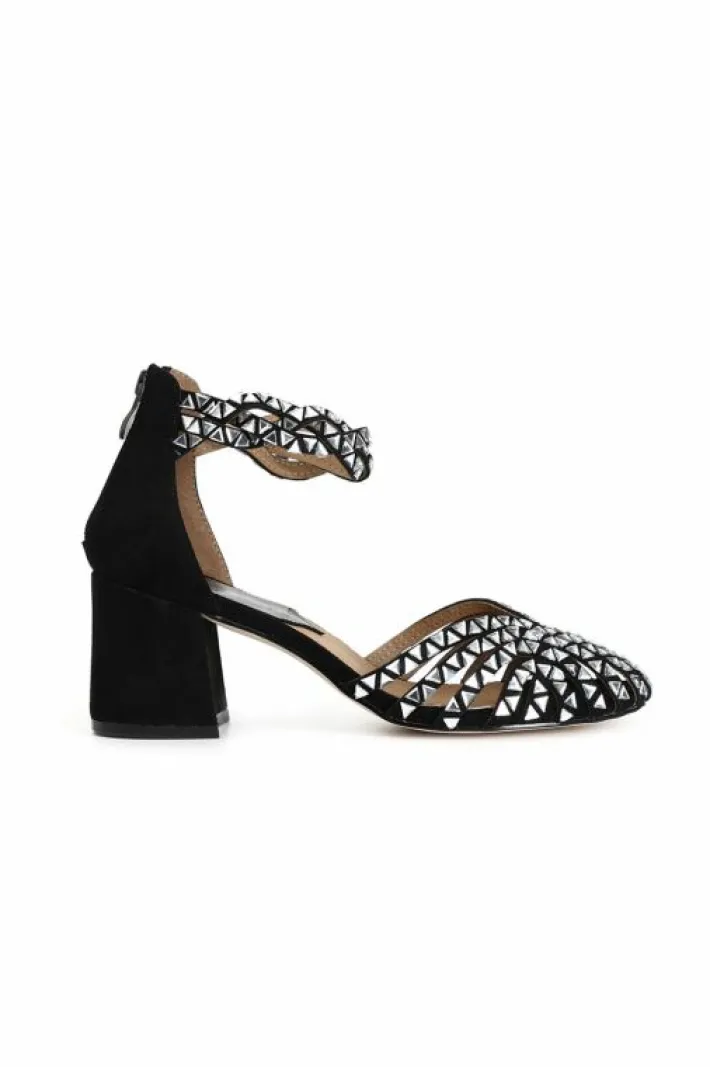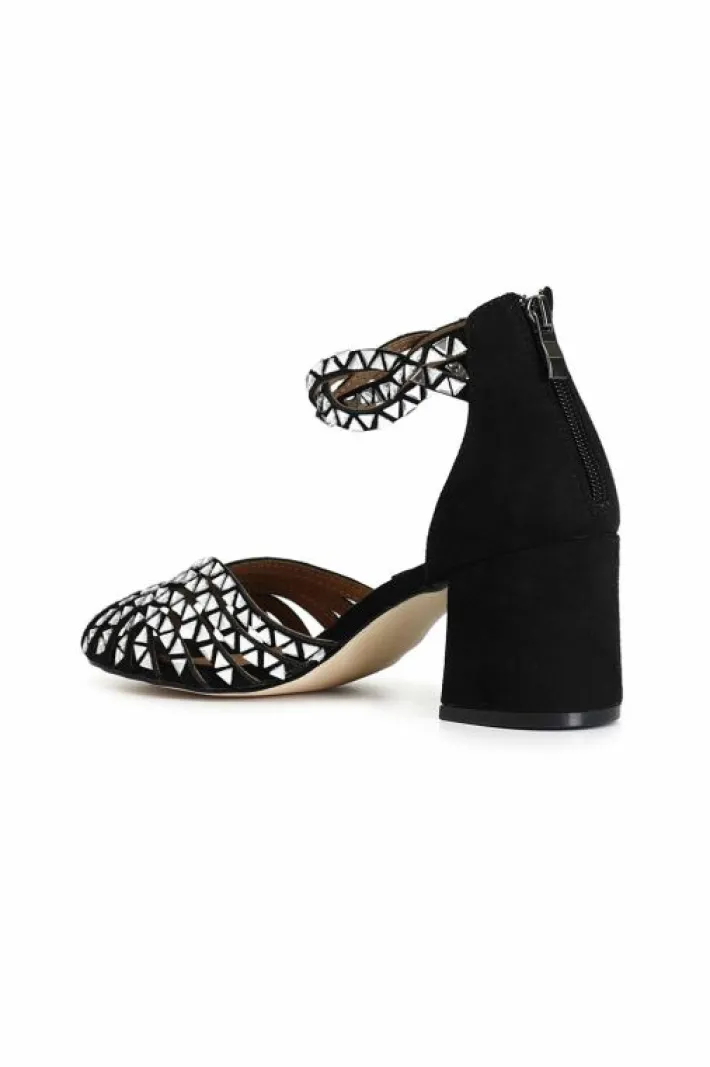 Sandali a gabbia con cerniera sul toppone arricchiti da una treccia di strass triangolari alla caviglia. tacco alto 60mm.