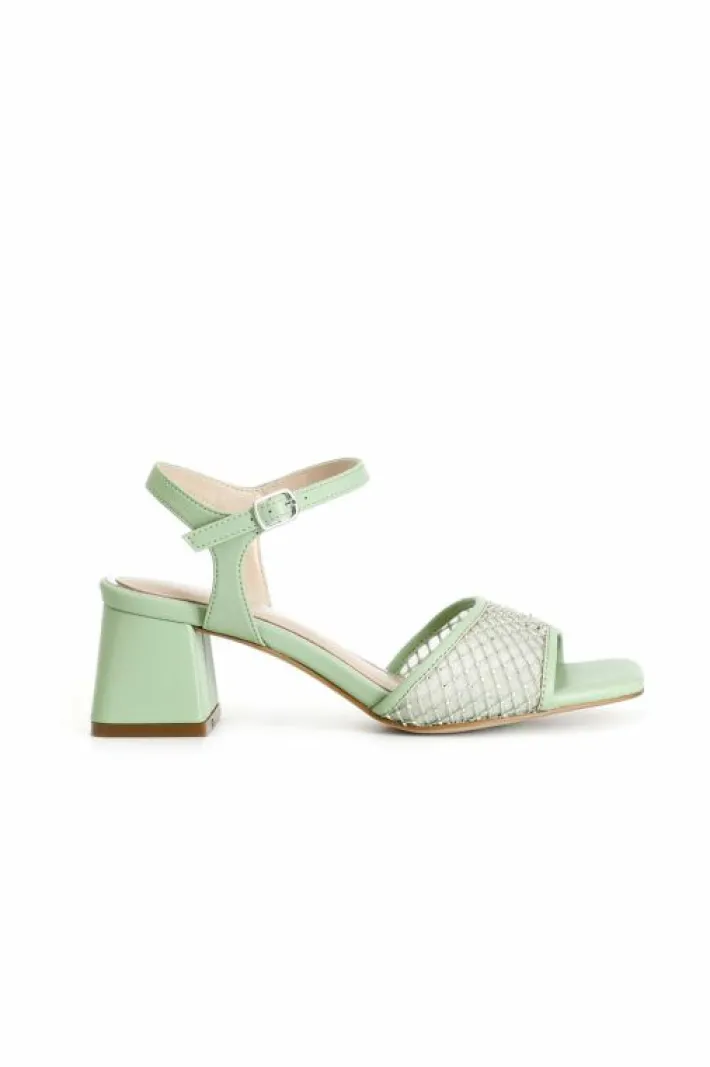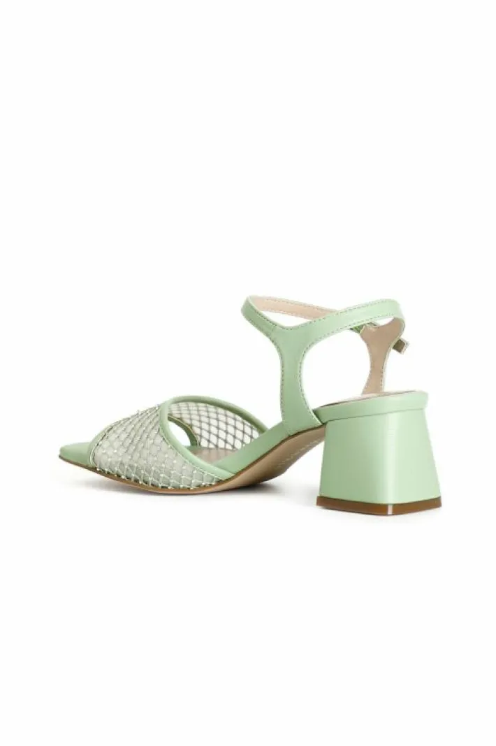 Sandali modello gilda con retina caratterizzata da strass. il soletto imbottito in vera pelle fa risultare la calzatura comoda anche dopo svariate ore di utilizzo. il tacco è di 50mm.