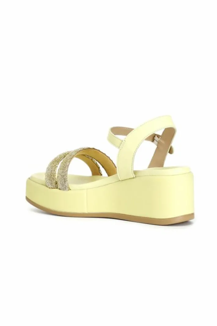 Sandali modello gilda con doppia fascia ricoperte da microstrass. una comoda e ampia zeppa con soletto imbottito fasciato in nappa.