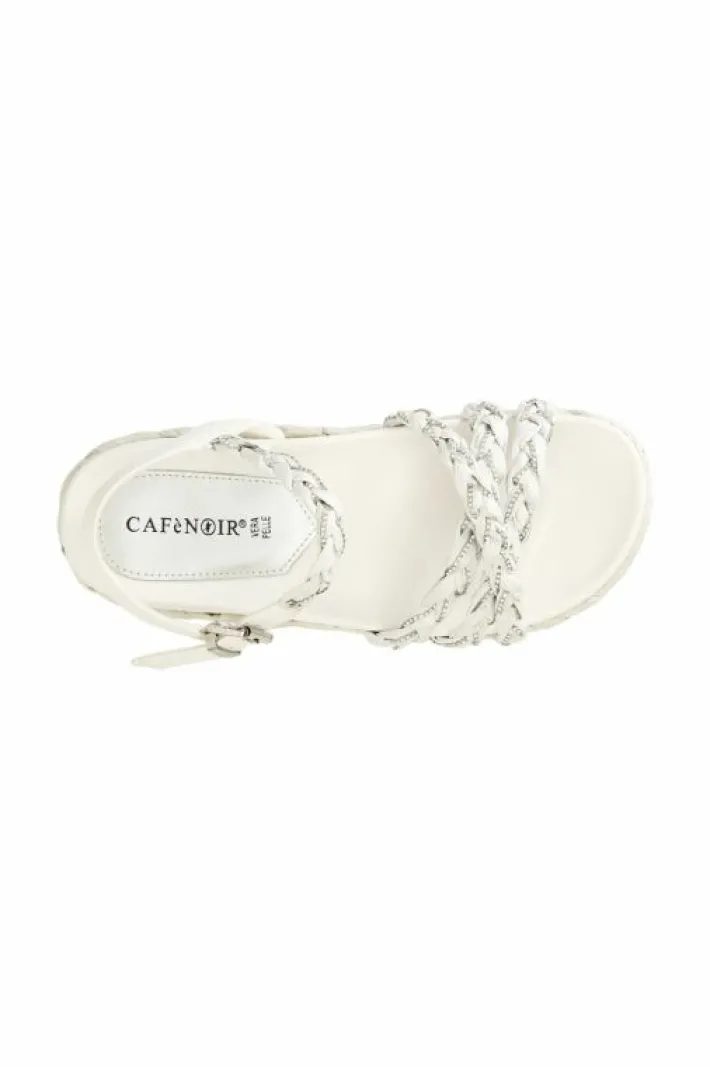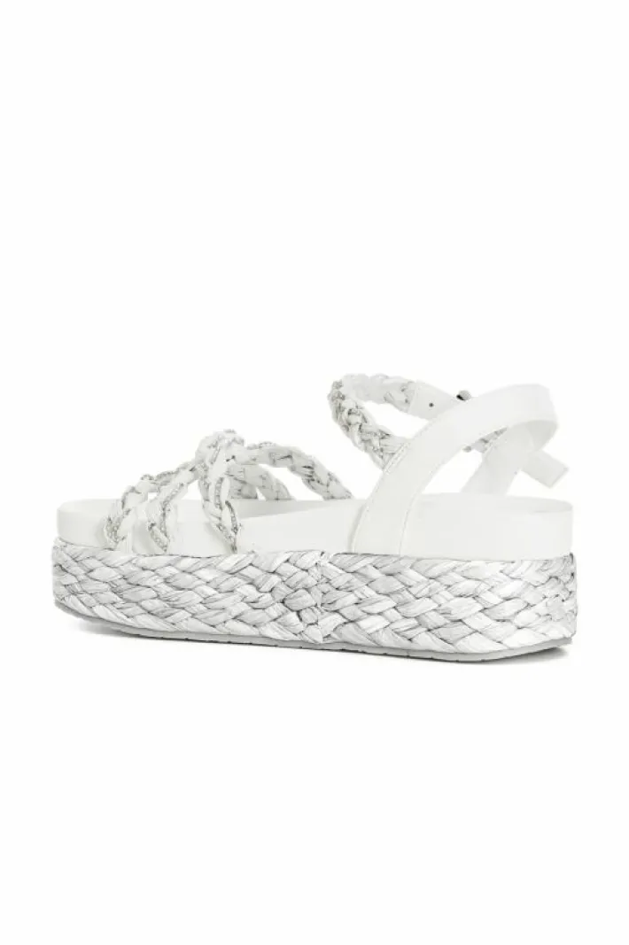 Sandali modello gilda color block con tre fasce in raffia intrecciate tra loro e con inserto in strass. comodo footbed e la zeppa è fasciata in raffia.