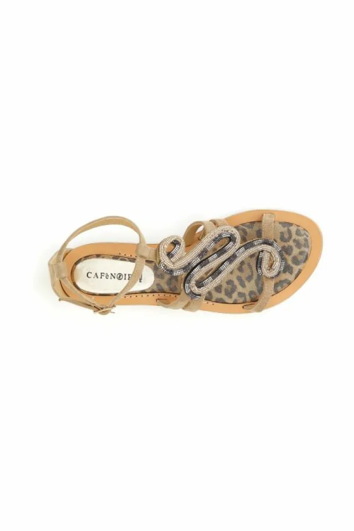Sandali in camoscio e stampa maculata con accessorio strass. comodo soletto imbottito per una calzata morbida. tacco alto 15mm. calzatura perfetta da abbinare a molteplici look.