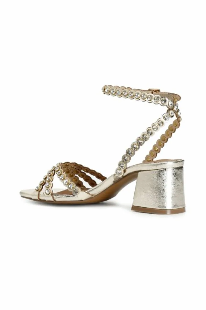 Sandali effetto metallizzato con strass. tacco medio. cinturino e fibbia regolabile alla caviglia.