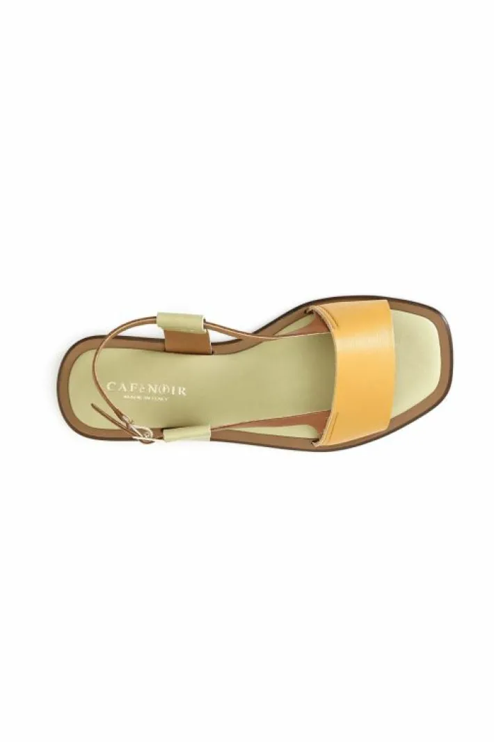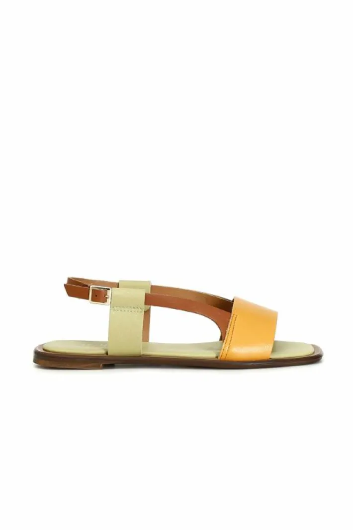 Sandali in pelle multicolor con cinturino che cinge il tallone. tacco basso e sapore etnico.