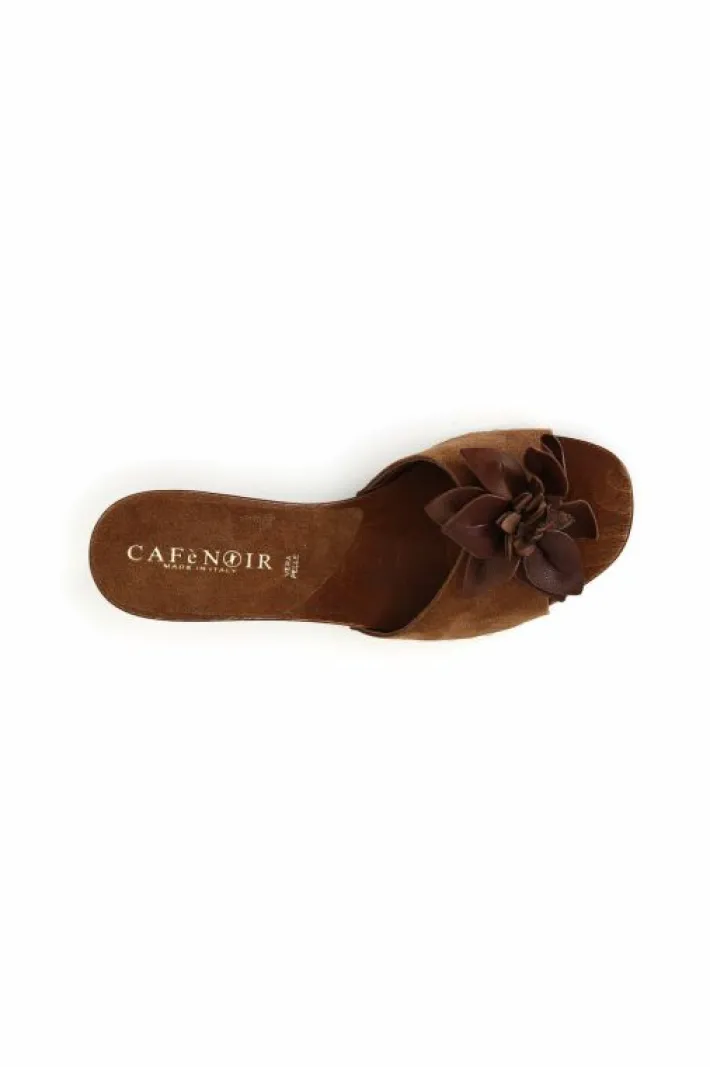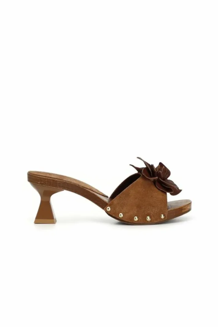 Sandali in pelle scamosciata con fascia decorara da un ricco fiore in 3d. tacco a clessidra cromaticamente abbinato alla fascia.