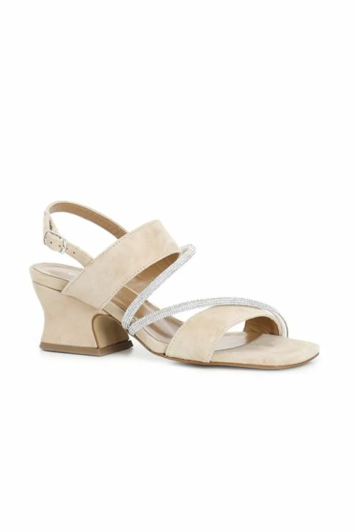 Sandali frate con due fasce pelle scamosciata e due listelli in microstrass. tacco a rocchetto bold.