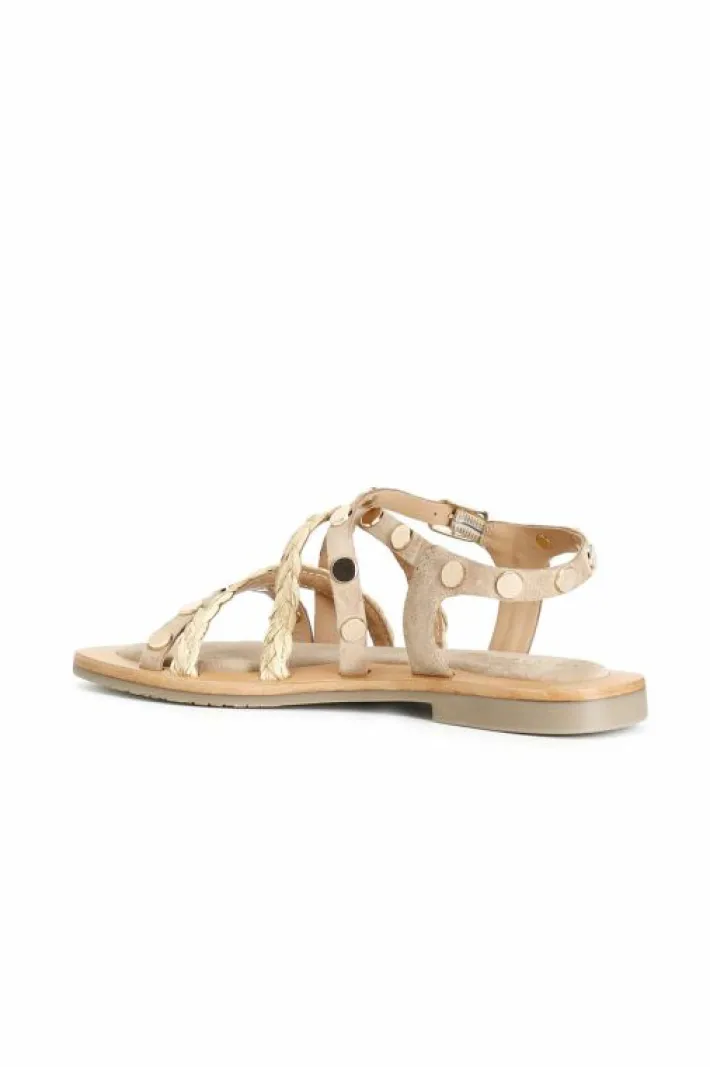 Sandali con fasce in pelle scamosciata e rafia alternate decorate da borchie doratee cinturino alla ciglia