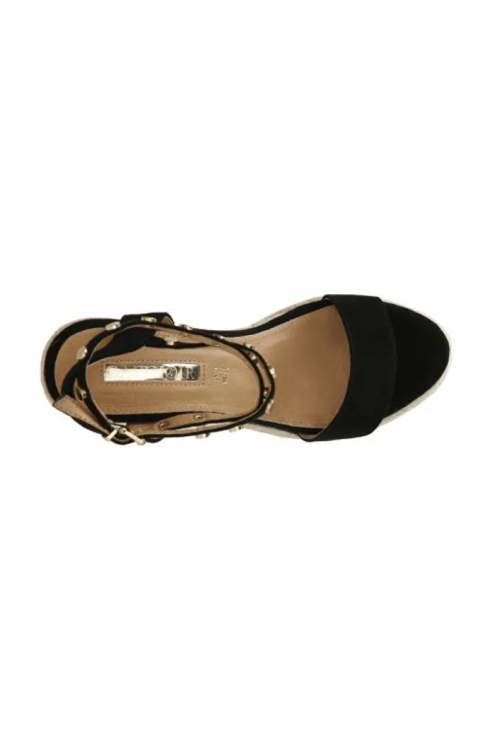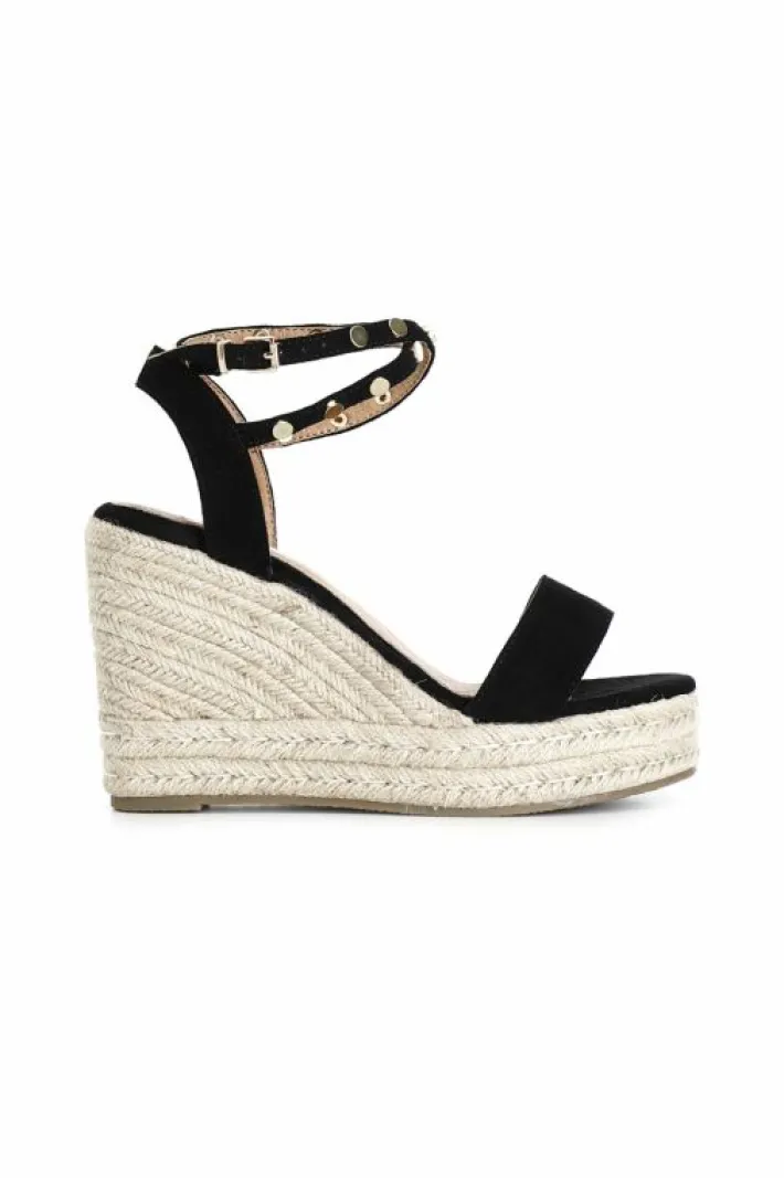 Sandali in tessuto su zeppa in corda e plateau. cinturino alla caviglia con borchie dorate.