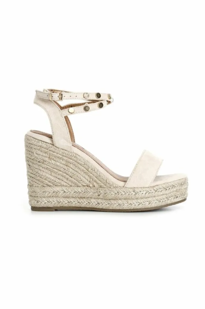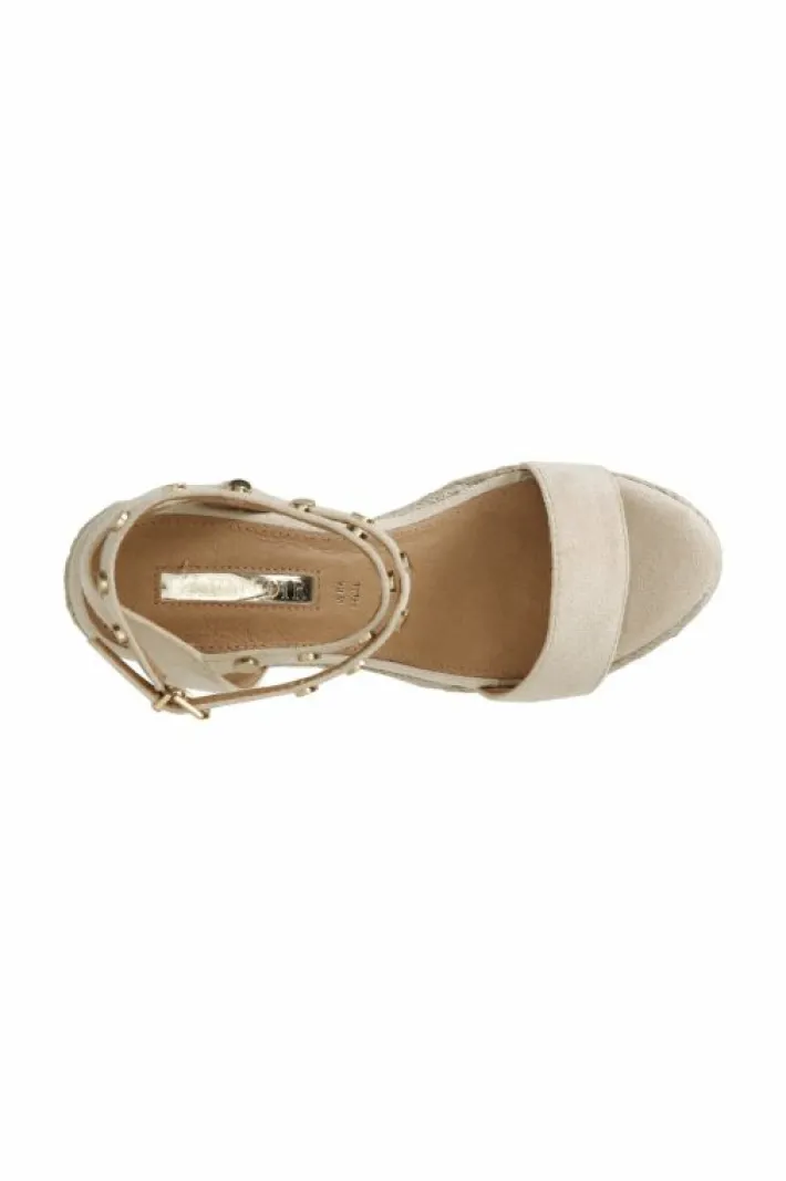 Sandali in tessuto su zeppa in corda e plateau. cinturino alla caviglia con borchie dorate.