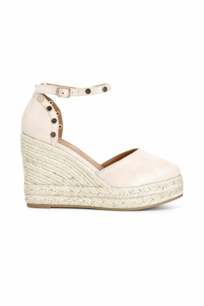 Sandali su zeppa in corda con cinturino alla caviglia in tessuto chiuso davanti e dietro con borchie dorate.